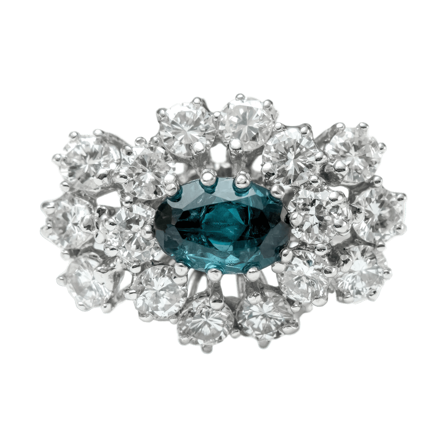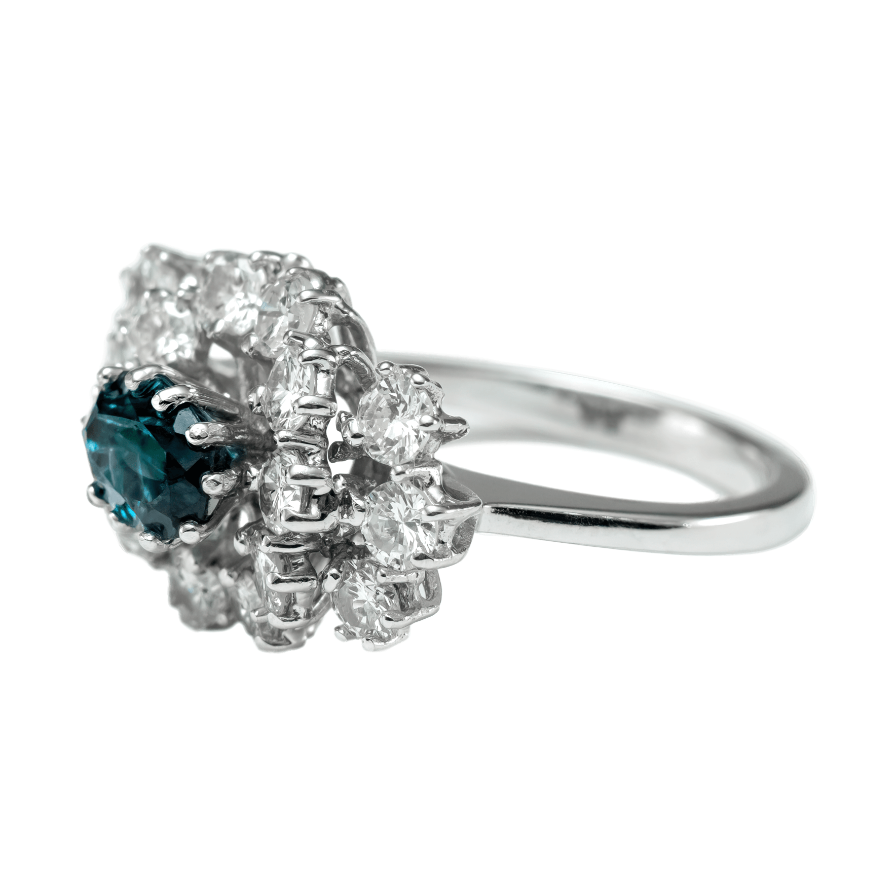 This gorgeous 14K white gold diamond cocktail ring contains an oval blue tourmaline, surrounded by 16 round brilliant cut diamonds of G-H in color with a VS2 to SI1 clarity, approximately 1.40 carats in total weight. Although tourmalines come in all colors, blue is the rarest. This gemstone measures 6.5 mm x 4.0 mm, approximately .74 carats in total weight. It is a ring that displays beautifully on the hand at 18 mm across and 3 mm wide.