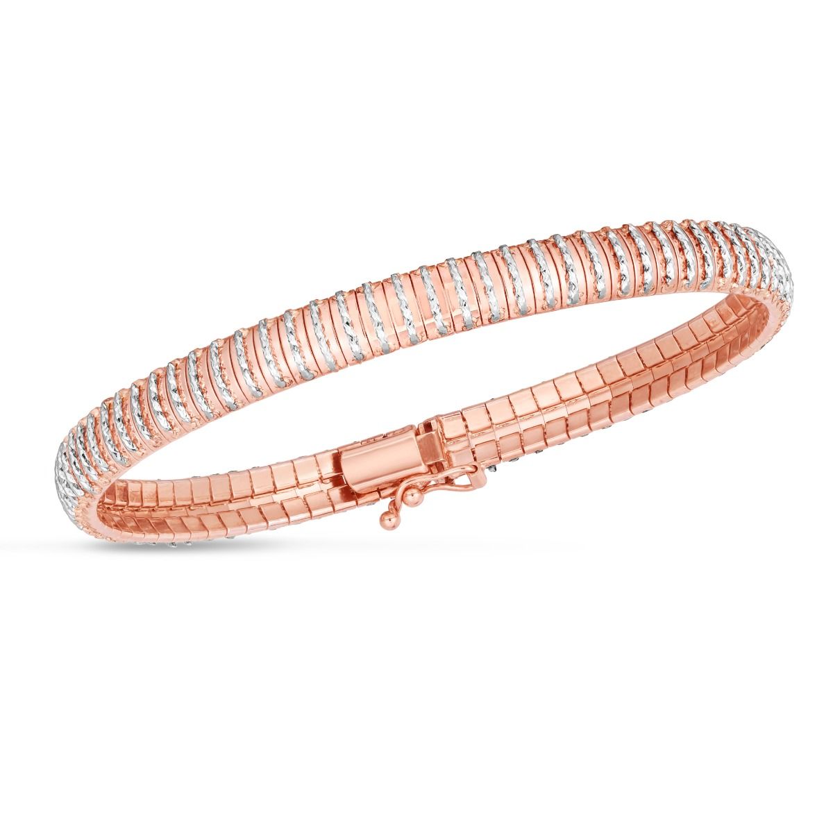 Elevate your wrist's style with this exquisite 14K Rose Gold Diamante Flex Bracelet. Boasting a 7 inch rose and white finish, this diamond-cut and textured bangle is made with a round, flexible form that exudes an air of sophistication. Secured with a figure 8 clasp, the bracelet is perfect for adding a touch of luxury to any look.