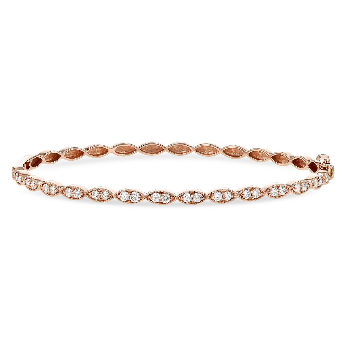 Delicately crafted with precious 14K rose gold, this exquisite diamond bangle bracelet exudes sophistication and timeless beauty. Accented with round brilliant-cut diamonds of G color and SI-3 clarity for 0.73ct eternity style of sparkle, the bracelet delicately wraps around the wrist in a marquise hinged design that can be extended with ease. Perfect for any occasion, wear this radiant piece alone or layered with other bracelets to add a touch of glamour to any look.