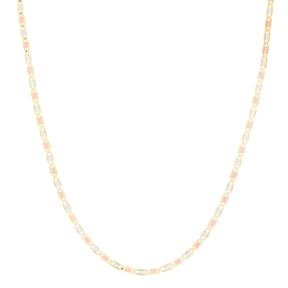 Broaden your style and make a statement with this exquisite 14K Tri-Color Gold 4.1mm Valentino Chain Necklace. Crafted with precision and attention to detail, this necklace is a true work of art. Made from high-quality 14K gold, it features a unique tri-color design that combines the richness of yellow, white, and rose gold. The diamond cut on the chain adds a touch of elegance and sparkle, catching the light from every angle. The lobster clasp ensures a secure and comfortable fit, so you can wear it with confidence all day long. This necklace is available in three stunning color variations and three lengths, allowing you to choose the one that best suits your personal style. Whether you are dressing up for a special occasion or adding a touch of sophistication to your everyday look, this Tri-Color Gold Valentino Chain Necklace is the perfect accessory to complete your ensemble.