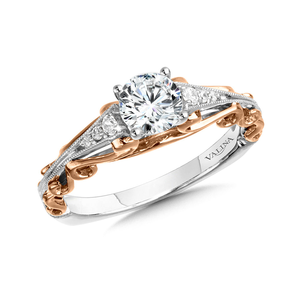 The 14K White & Rose Gold Decorative Tapered Diamond Engagement Ring is an exquisite piece of jewelry that will take your breath away. The ring features a beautifully tapered and milgrain detailed diamond shoulder that draws your eye to the center stone. The embellished rose gold swirled filigree edges add an heirloom feel, making it the perfe carat ring for those who love classic elegance. This stunning ring is crafted from 14K rose and white gold, which gives it a unique and sophisticated look. The center stone is sold separately, which gives you the freedom to choose a stone that best suits your taste and budget. Whether you are proposing to your significant other or adding a touch of elegance to your jewelry colle caration, this ring will make a statement of style and sophistication.