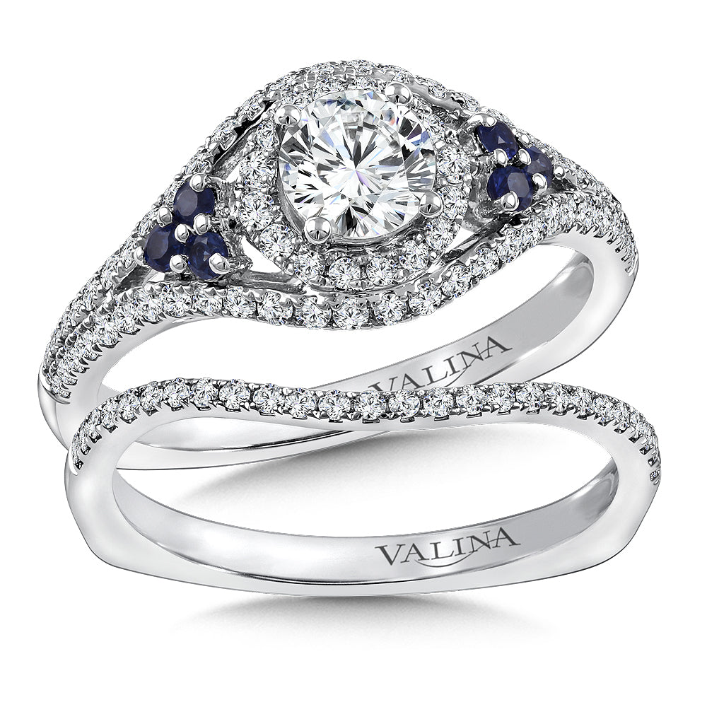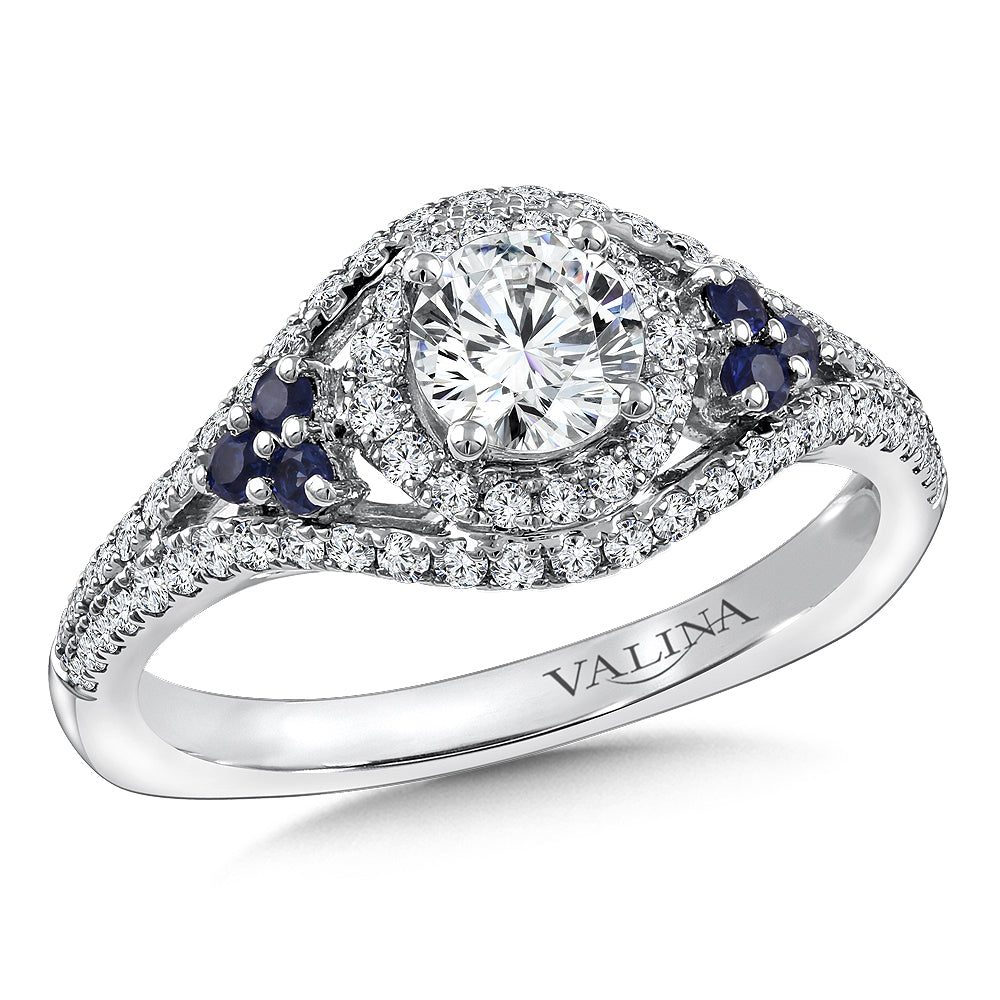 14K Two-Tone Gold Diamond And Blue Sapphire Halo Split Shank Engagement Ring
