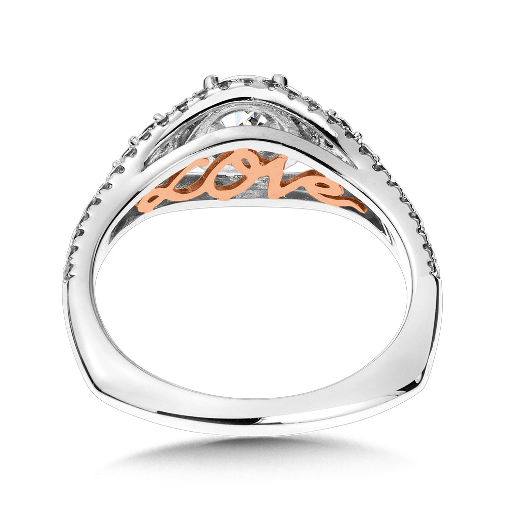 From above, you see a stunning center stone framed in a diamond halo which is wrapped by the eye-shaped split shank. Three blue sapphire gemstones fill the space between the shank's split and the halo, creating a cohesive and stunning upper design. From below, you see that the inner shank features a hidden surprise - the word "love" is written out in glowing rose gold. With the mixture of blue sapphire and a hidden rose gold message, this diamond engagement ring is sure to wow the people in your life.