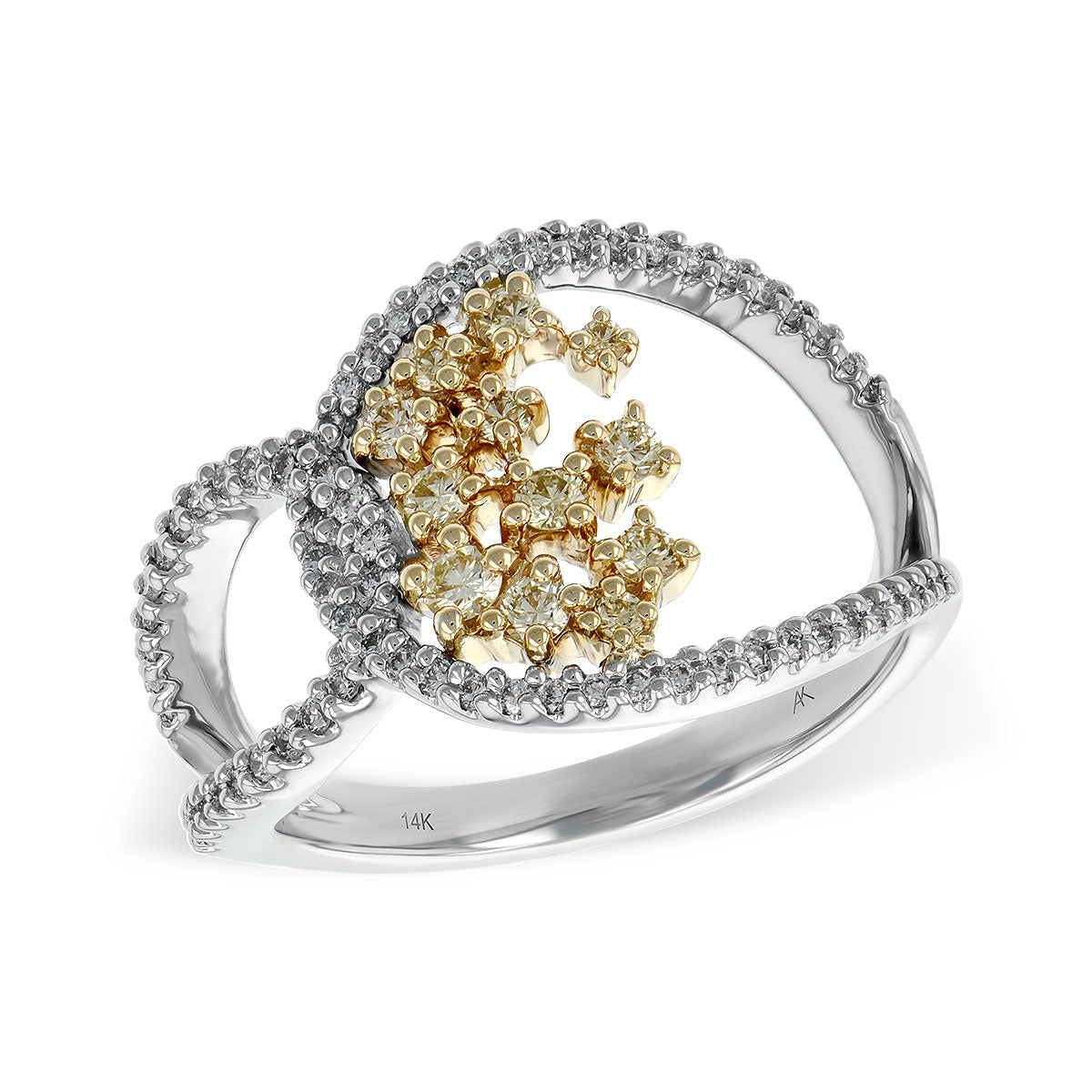 Surround yourself with a constellation of 0.74 carats of yellow and white diamonds with this 14K White & Rose Gold Diamond Loops & Scattered Stars Ring. Embrace the subtle romance and enchanting whimsy of this breathtaking piece. It's a design that captures the way the stars shine, bringing a little bit of the night sky right to your finger. Perfect for adding a touch of sparkle to any look.