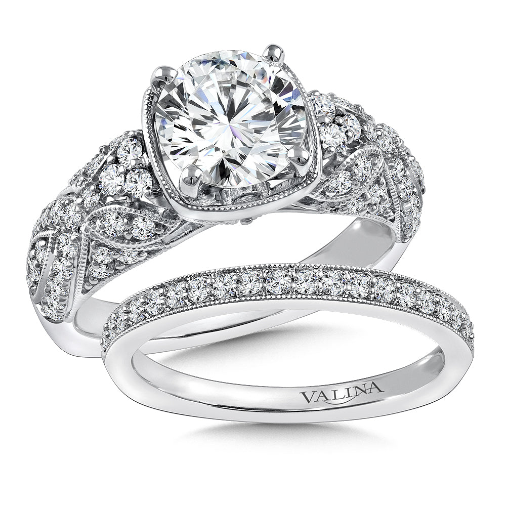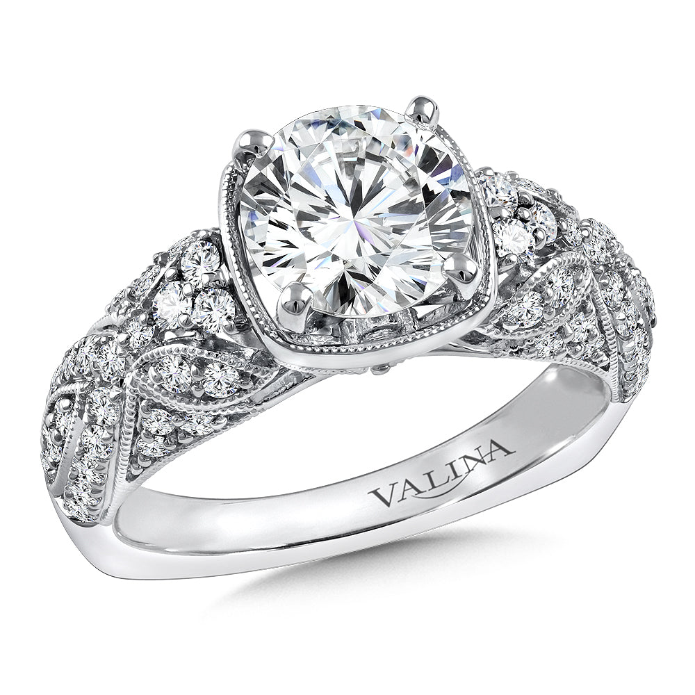 This design features a round 1 �� carat center stone outlined by a thin milgrain halo instead of a classic diamond halo. This giant center stone is then enhanced by the ring���s wide and intricate shoulders which are filled with diamonds and covered in beautiful milgrain veins forming leaf and vine patterns. The word "Love" appears on the inner shank, highlighted with rose gold. The shank���s width and unique loving details truly elevate this vintage engagement ring into a piece of statement jewelry that any bride would treasure for the rest of their life.