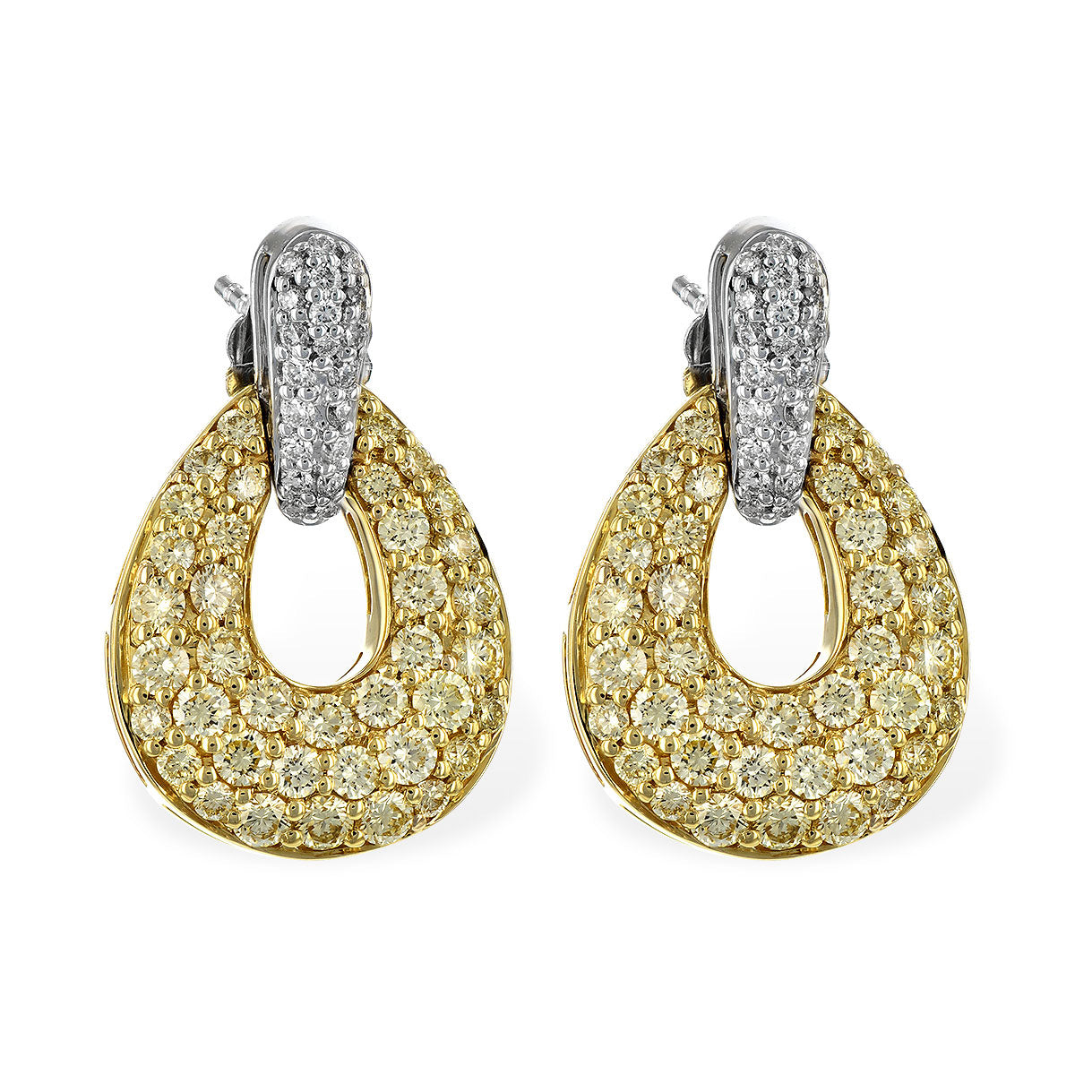 These stunning earrings are crafted from 14K two-tone white and yellow gold, making them a versatile addition to any jewelry collection. The yellow diamonds in the center of each earring have an average clarity of SI1 to SI2 and an average color of O-P, making them an affordable yet beautiful choice for those seeking a pop of color. With a total carat weight of 1.65 carats, these earrings are sure to catch the eye and make a statement. The two-tone gold design adds a unique touch to these already beautiful earrings, making them perfect for both casual and formal occasions.