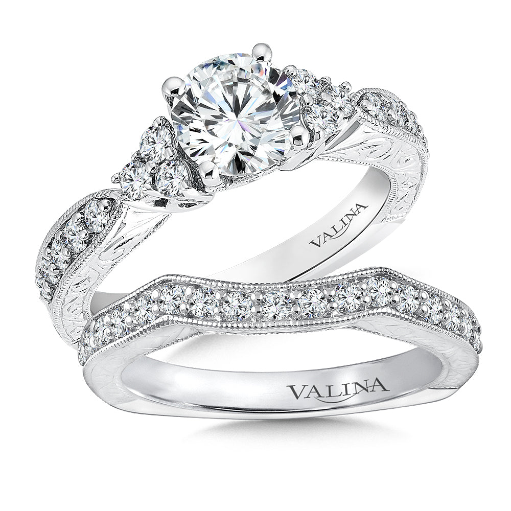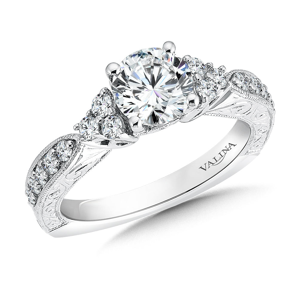 A triangle of diamonds followed by a pinched sparkling band sets the stage for the stunning center stone. Hand engraving and milgraine finish add an heirloom feel.