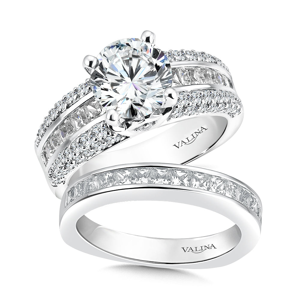 This 14K White Gold Channel and Pave-Set Diamond Engagement Ring is crafted to impress and designed to last a lifetime. The wide, heavy 14K white gold band is channel-set with Princess cut diamonds, bordered by two rows of rolled pave-set diamonds that lead to the majestic round center stone. A peek-a-boo diamond in the gallery adds extra sparkle to the overall beauty of the ring. The Euro-shank ensures comfort during daily wear and the ring can be paired with a stunning center stone of your choice. If you want to make a statement with a ring that refle carats your love and commitment, this engagement ring is the perfe carat choice.