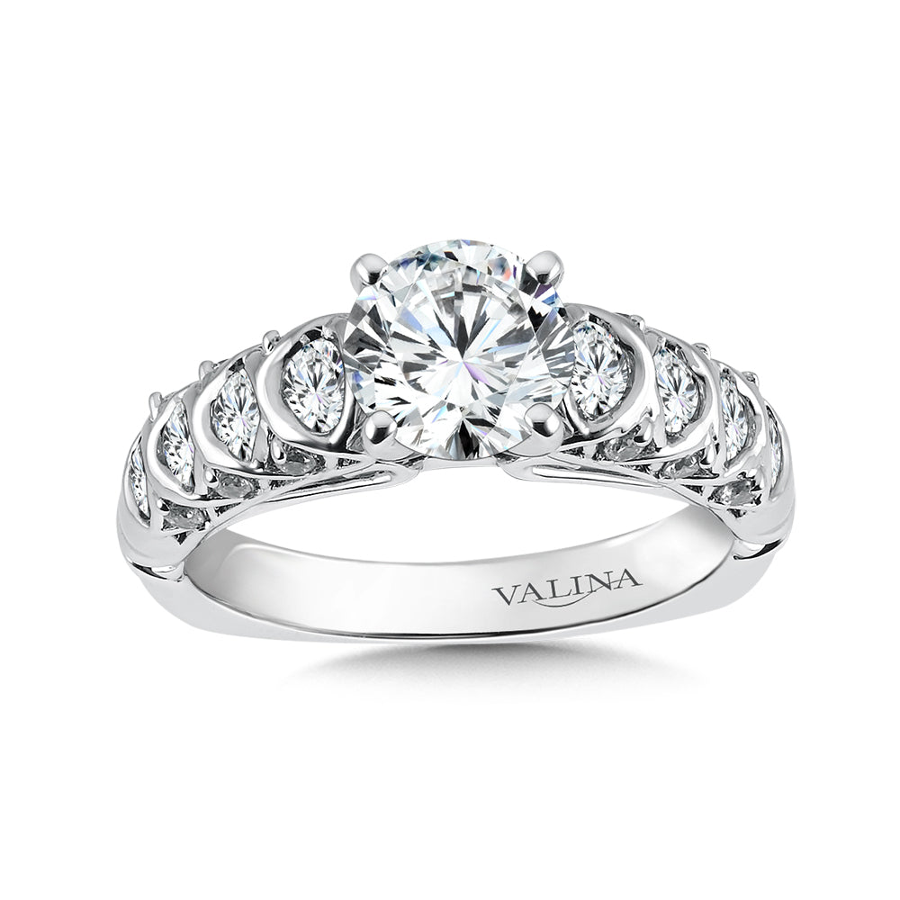 ���Ring features a band diamonds decorating the top and sides of the ring with unique criss cross 14K white gold metal detailing. This ring is part of our Classic Elegance Colle caration. Style includes platinum head.