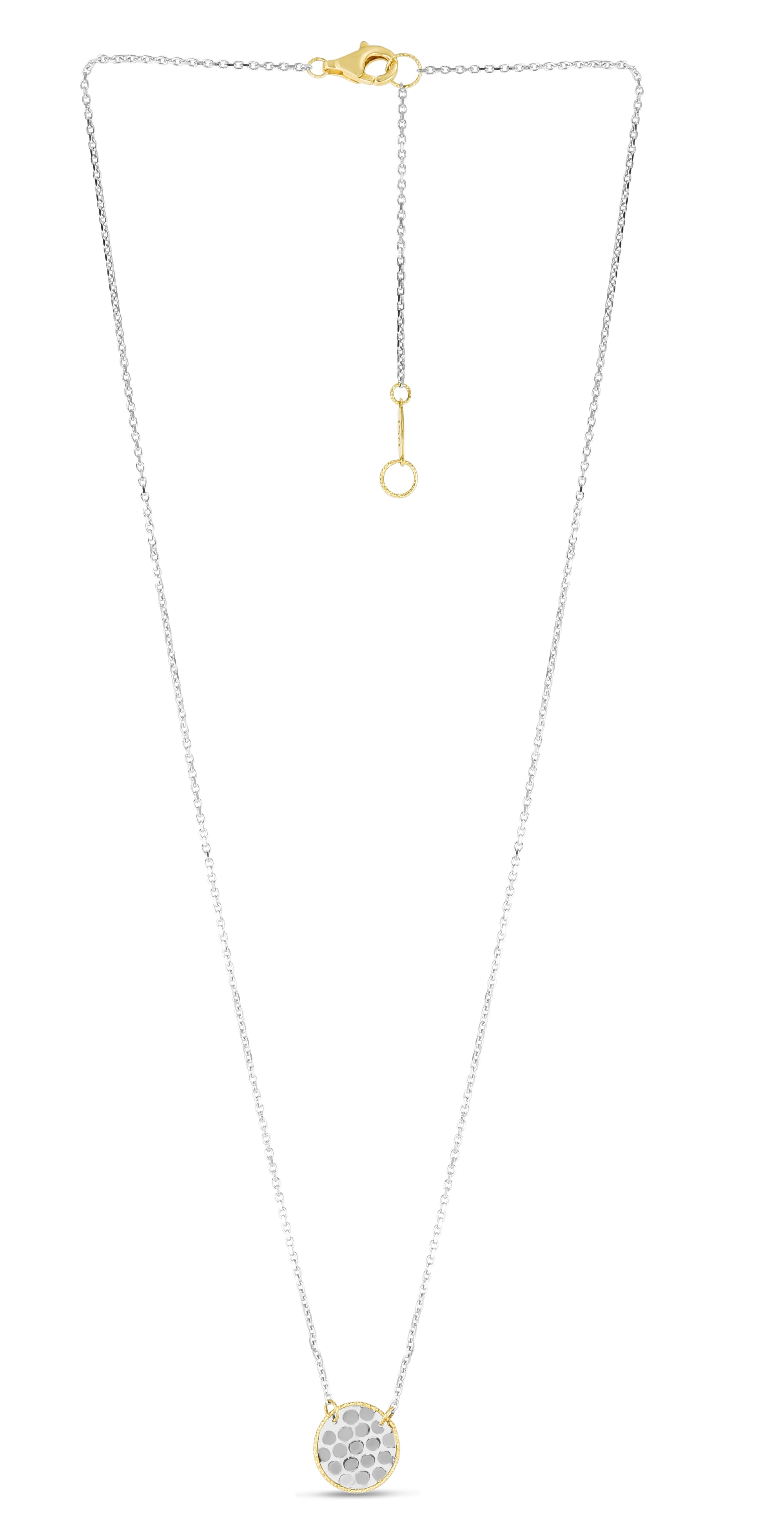14K White Gold 18" Diamond Cut Confetti Round Disc Necklace. Total length 18" with Jump Ring at 16" and Lobster Clasp. Framed by a layer of textured yellow gold. Made in Italy.