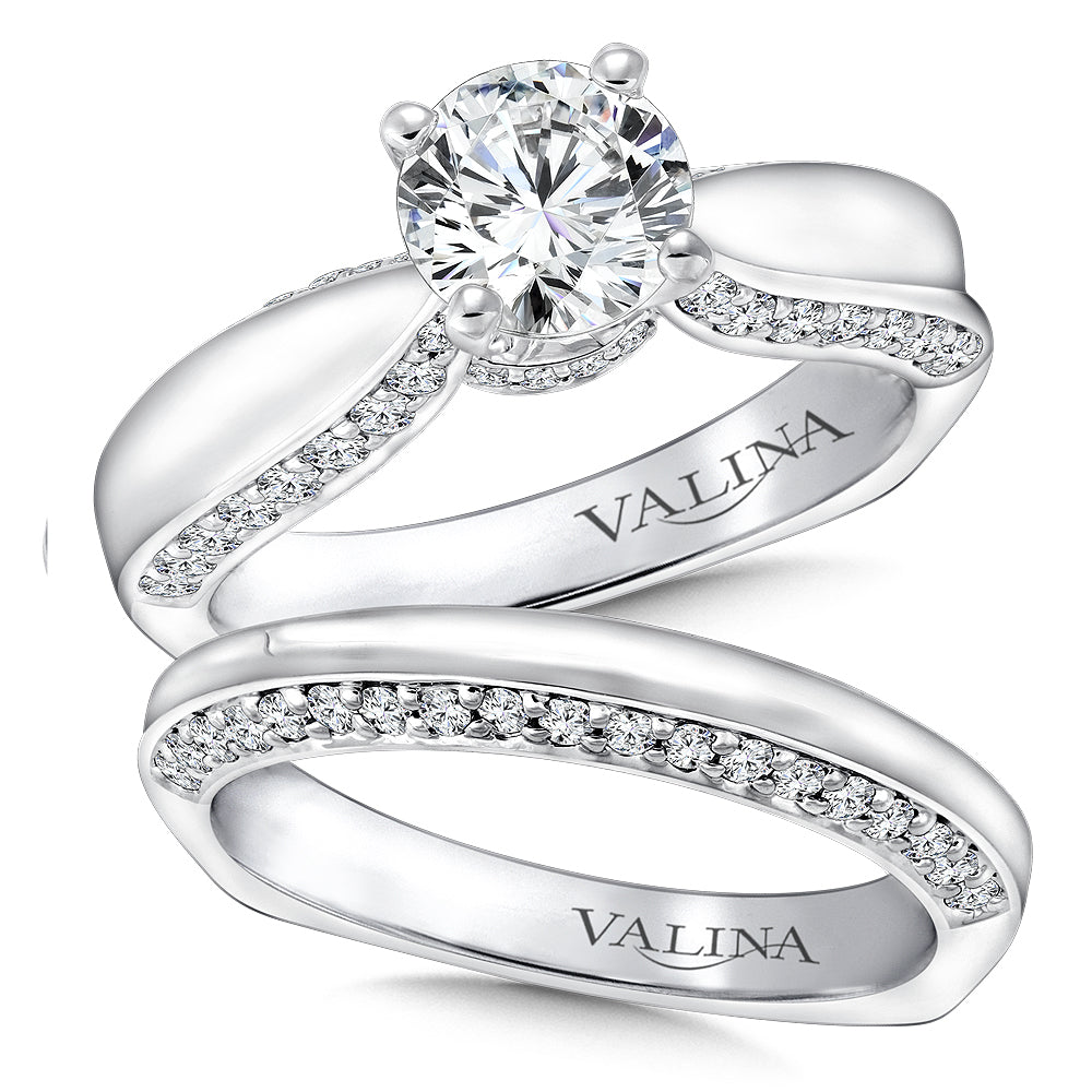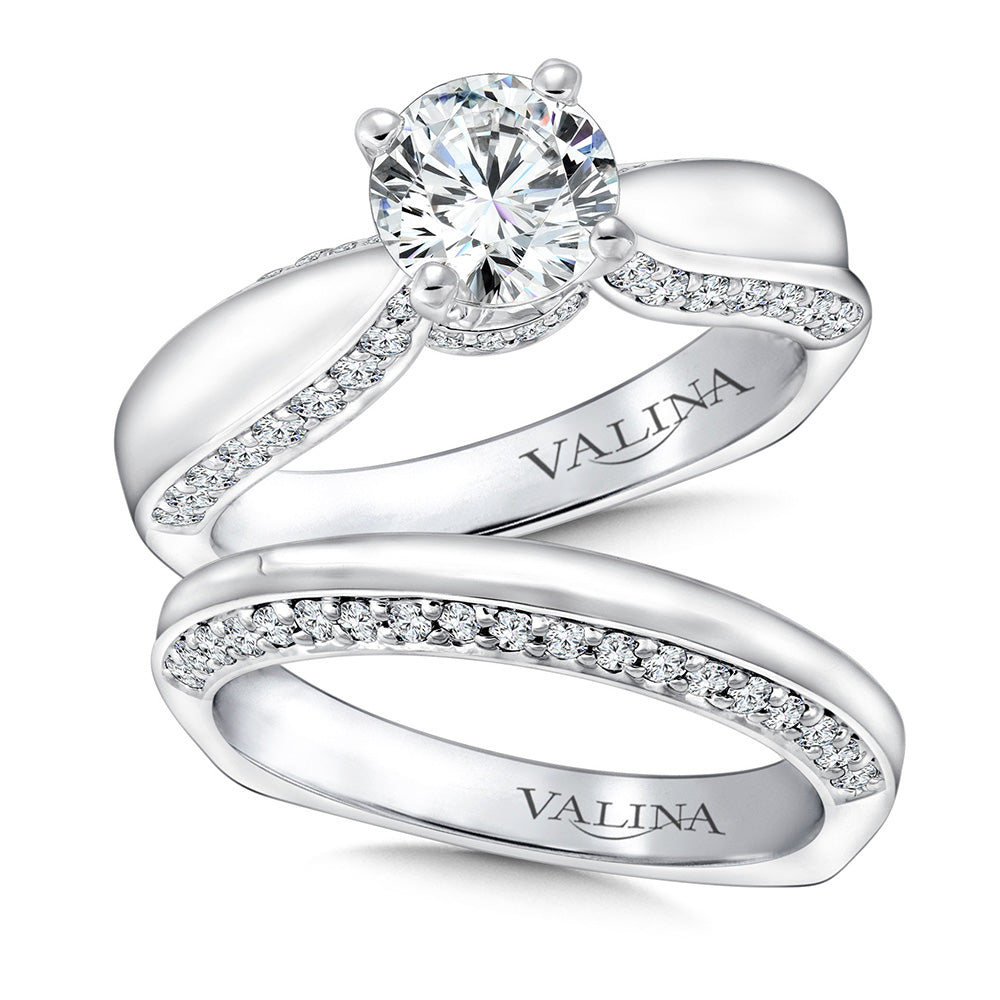 A beautifully contoured 14K white gold engagement ring with a diamond crown and diamonds laced on the front and back edges of the band is ready for a 1.00 carat round gemstone.