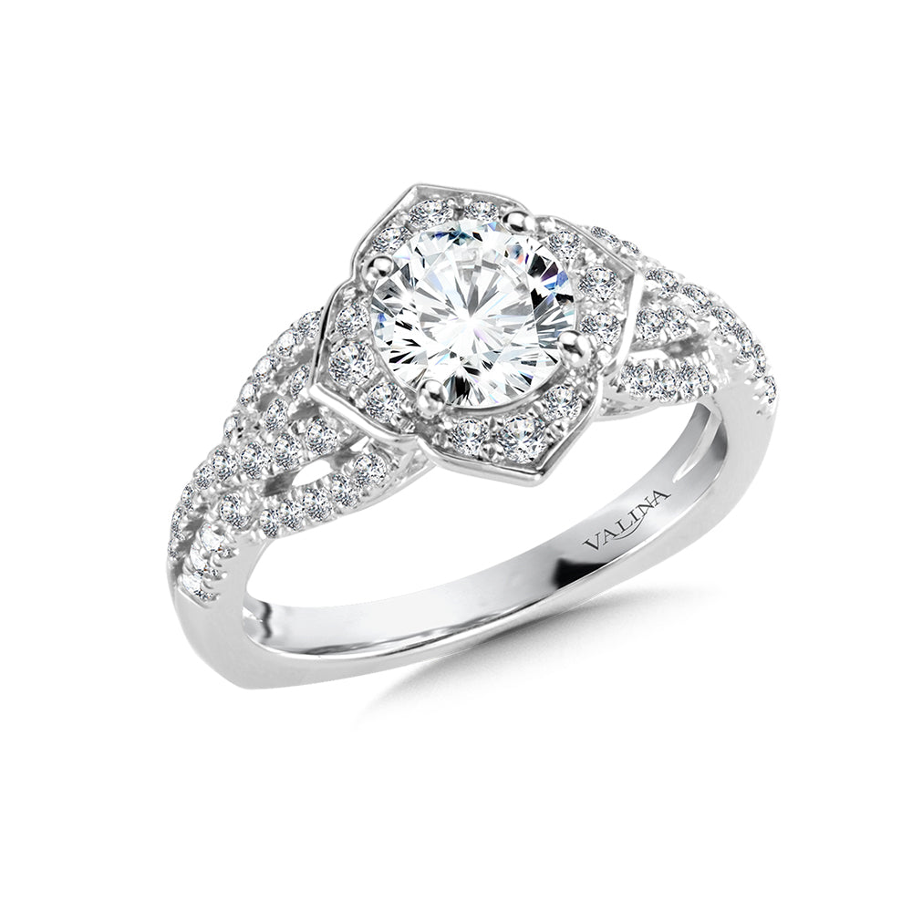 14K White Gold Criss Cross Diamond Floral Halo Engagement Ring