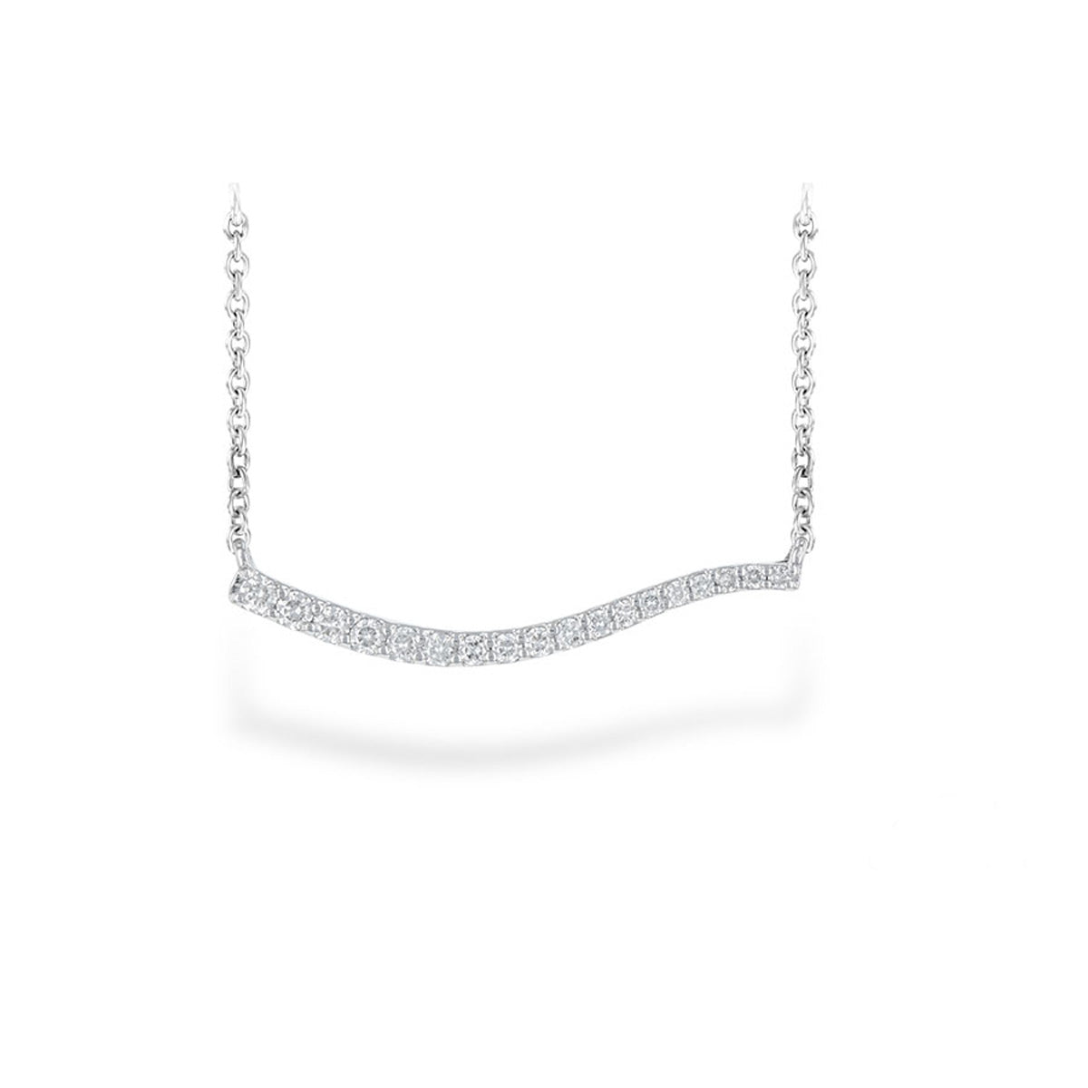 You will love this sexy, 14K white gold curved and tapered bar necklace is set with brilliant round diamonds. The bar necklace is prong-set set with 0.25 carats of diamonds G color and SI3 clarity.
