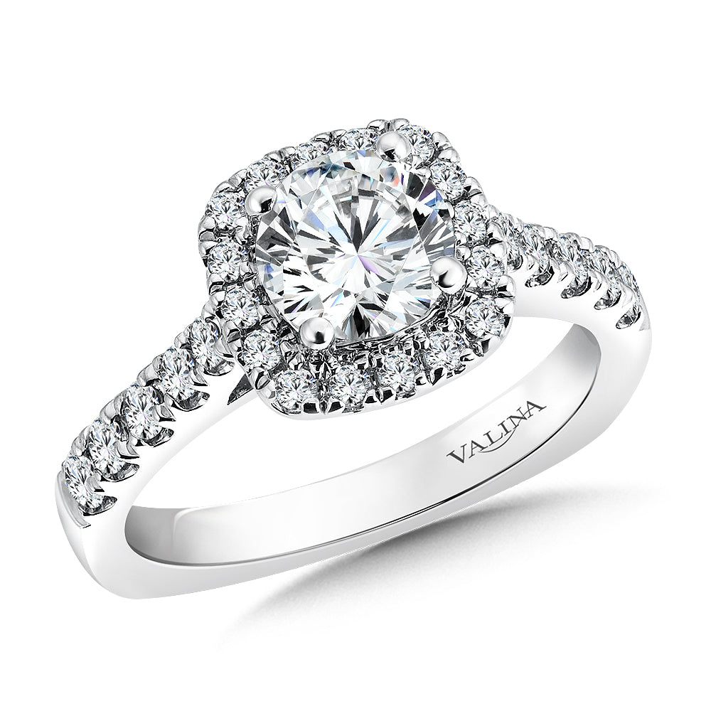 14K White Gold Cushion Shape Halo And Diamond Band Engagement Ring