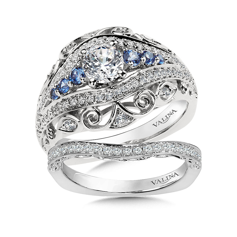 14K White Gold Decorative Diamond And Blue Sapphire Scroll Engagement Ring