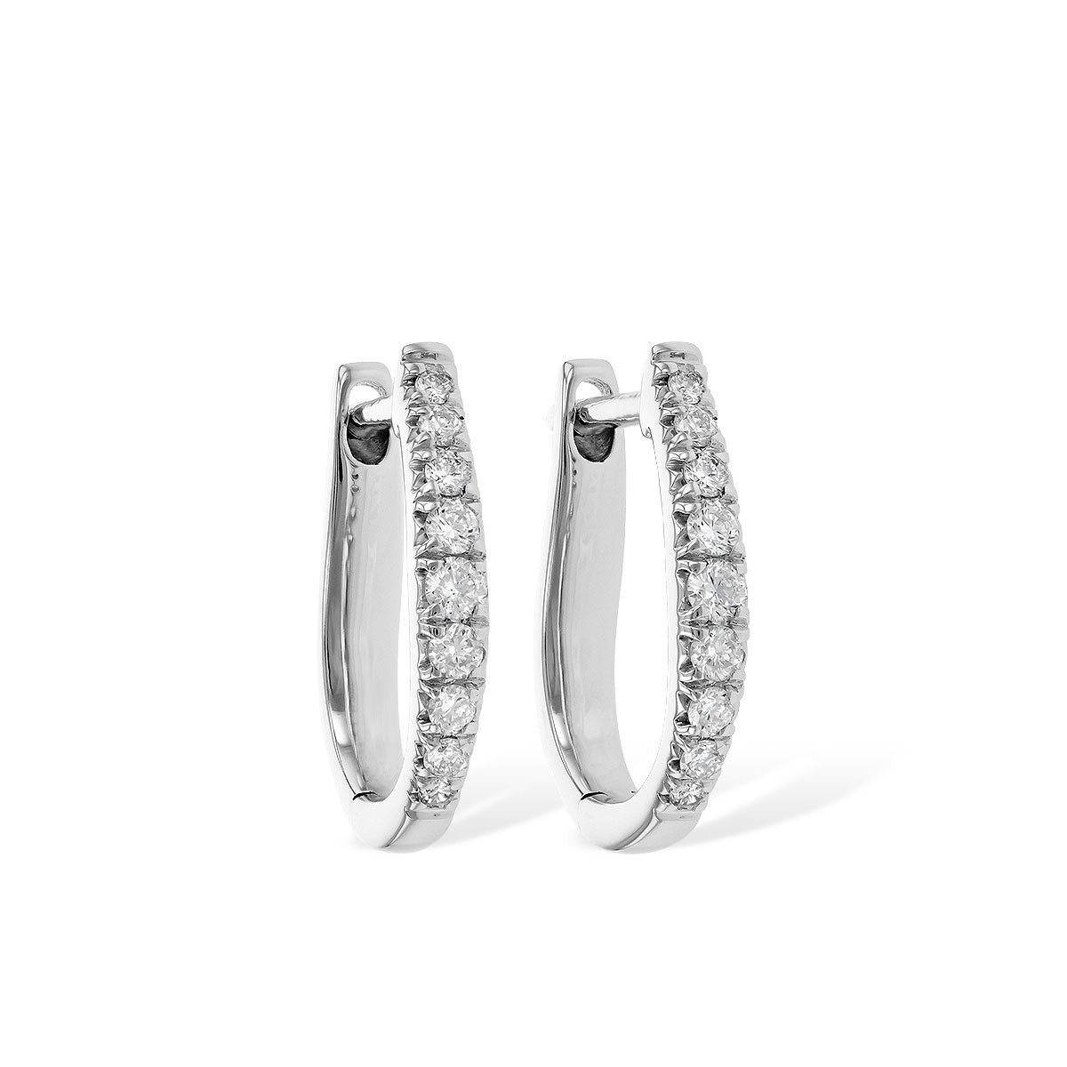 These are tailored 14K white gold J hoop earrings set with graduated diamonds. These striking earrings contain a .25 carat total weight of round brilliant cut diamonds of G-H color and SI1 to SI2 clarity set in french-prongs with a hinged hoop and snap locking closure.