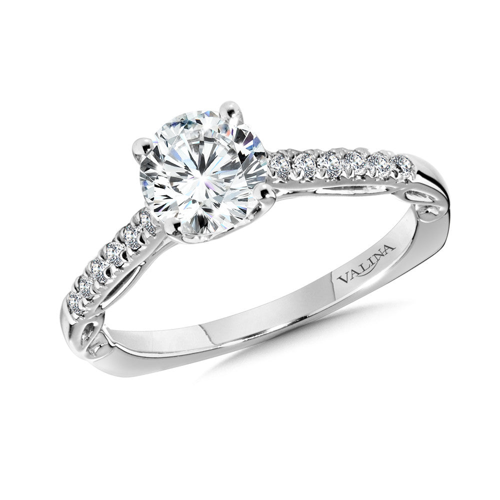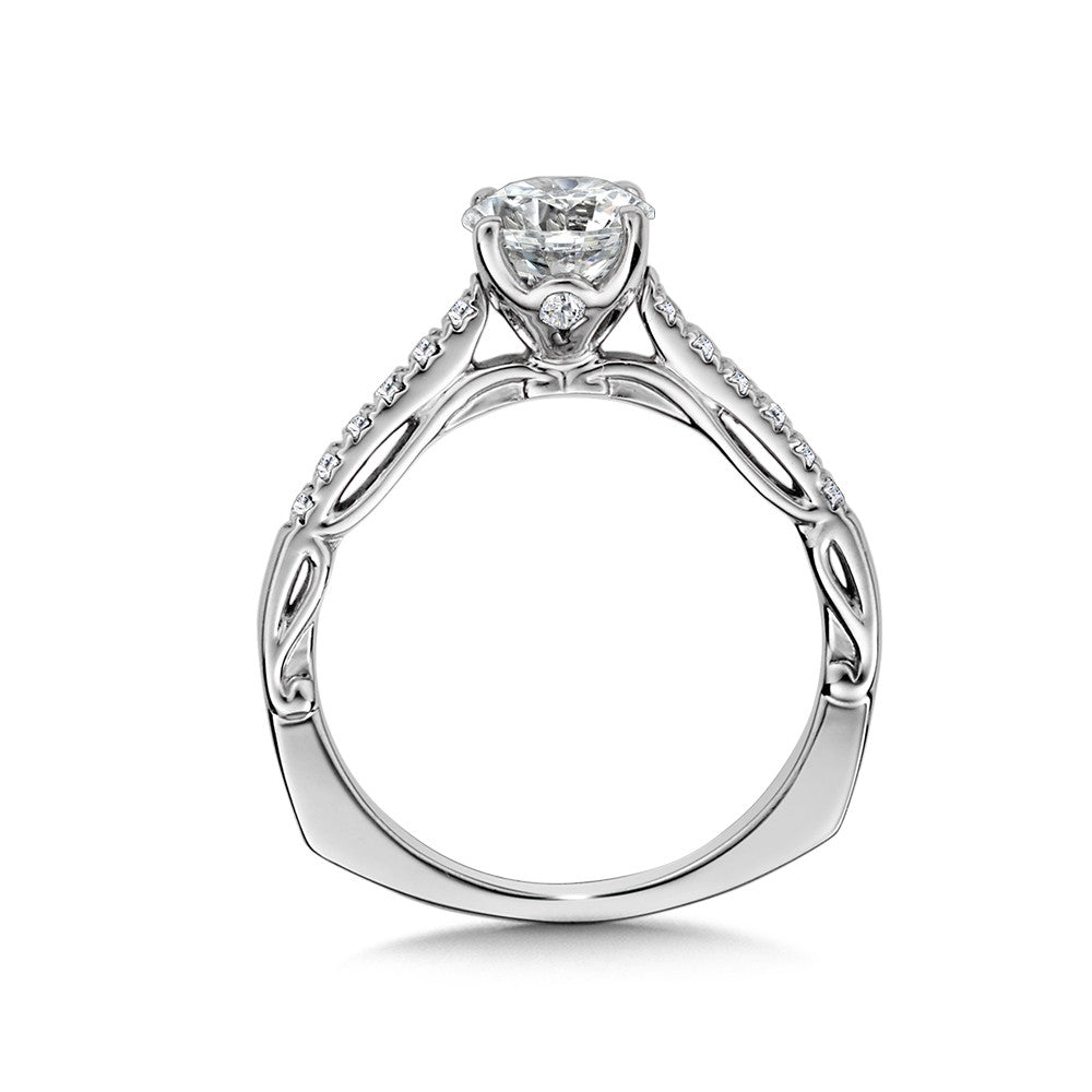 The 14K White Gold Diamond Grace Engagement Ring is the epitome of timeless elegance. This stunning diamond engagement ring features a unique ribbon-like profile detailing that adds a touch of individuality to the classic cathedral mounting. The ring is crafted from high-quality 14K white gold, giving it a lustrous, luxurious finish that perfectly complements the brilliance of the diamonds. The accent gems add a touch of glamour to the ring, making it fit for a queen. The European shank provides additional comfort for the person who wears it. The Diamond Lace Engagement Ring is an exquisite piece of jewelry that is sure to take your breath away.