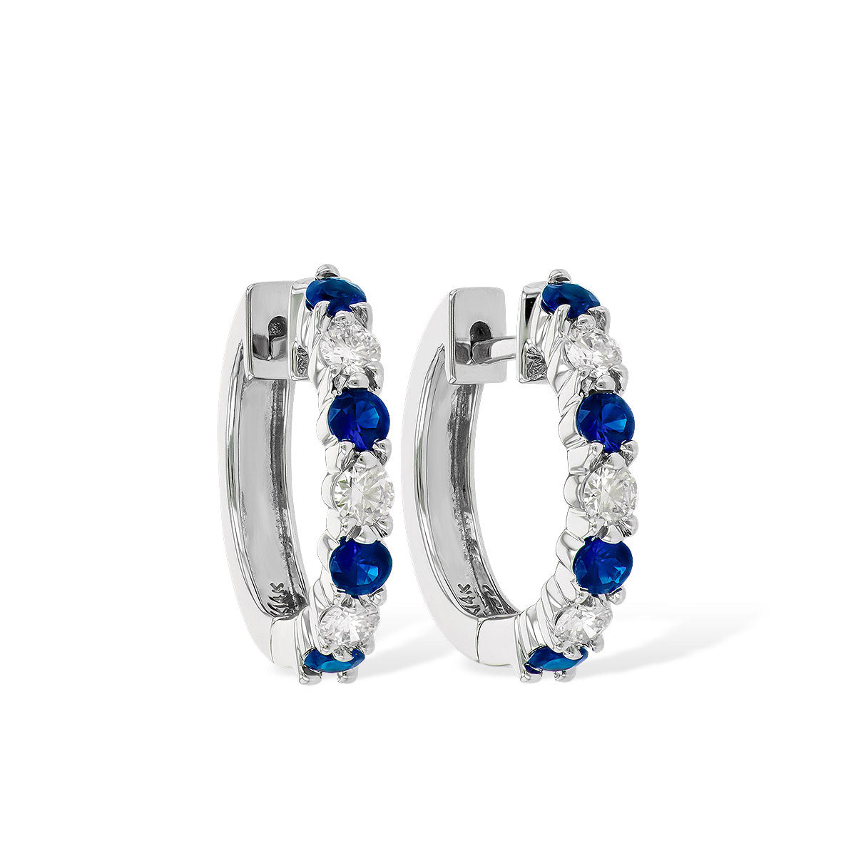 Enjoy these beautiful classic anniversary style sapphire and diamond hoop earrings set in 14K white gold. These earrings have bright round brilliant-cut sapphires separated by double diamonds. The total weight of the sapphires is .64 carats total weight and the diamonds are .41 carat total weight of round brilliant cut diamonds of H color and SI1 clarity set in a hinged hoop with a snap-lock closure.