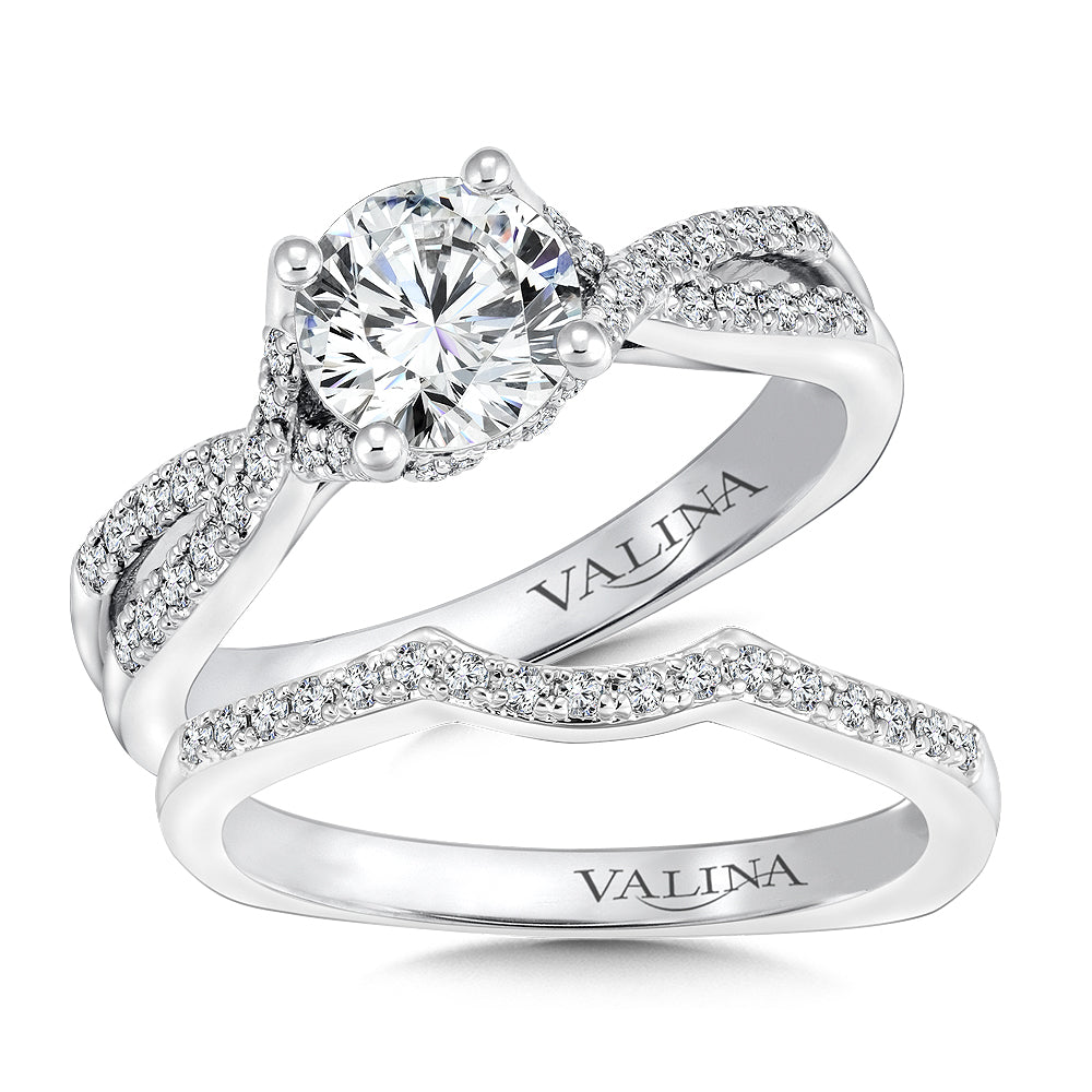 Diamond bands cross one another and cathedral up forming the four prongs that securely set the center stone in this flowing design. A diamond encrusted motif decorates the undergallery.