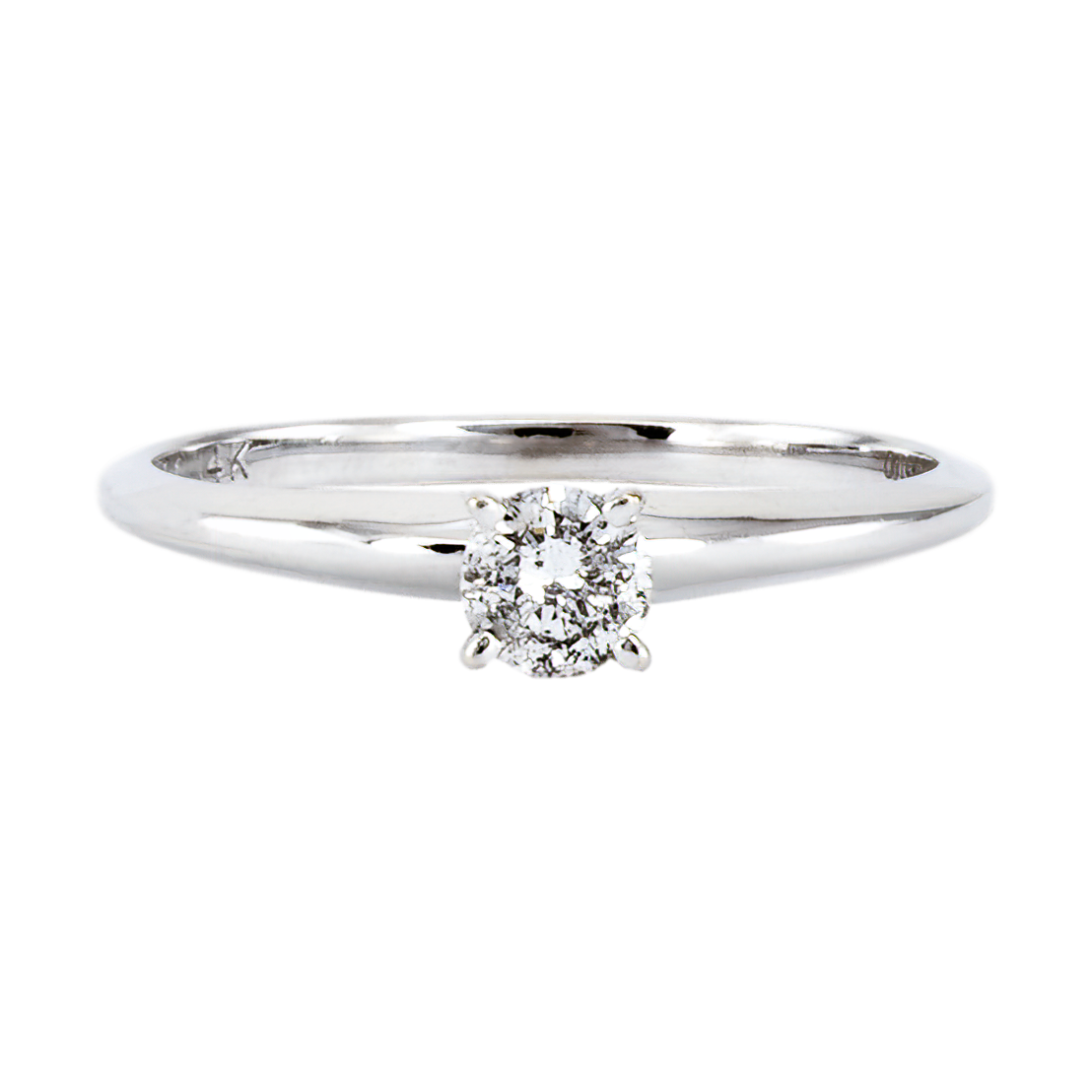 A lovely 4-prong 14K white gold mounting sits atop this Tiffany-style ring, featuring a round brilliant cut diamond with an H color and SI2 clarity grade, measuring 3.8 mm, and approximately .25 carats in total weight
