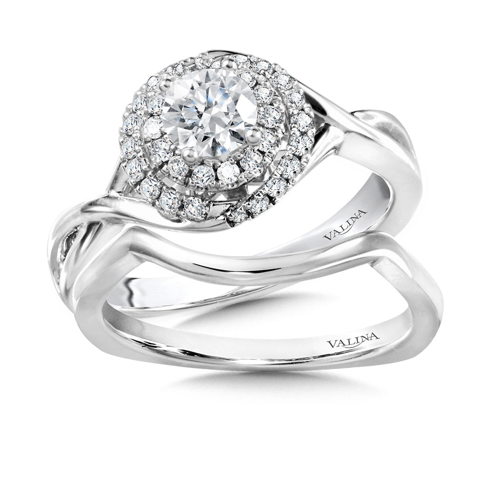 The center stone���s first halo perfe caratly frames the diamond with a unified circular shape. The second halo crisscrosses from the shank below, transforming into two separate diamond bands that nearly look like one. The crisscross style of the golden shank plays on infinite motifs, reminding you that your love is never ending.
