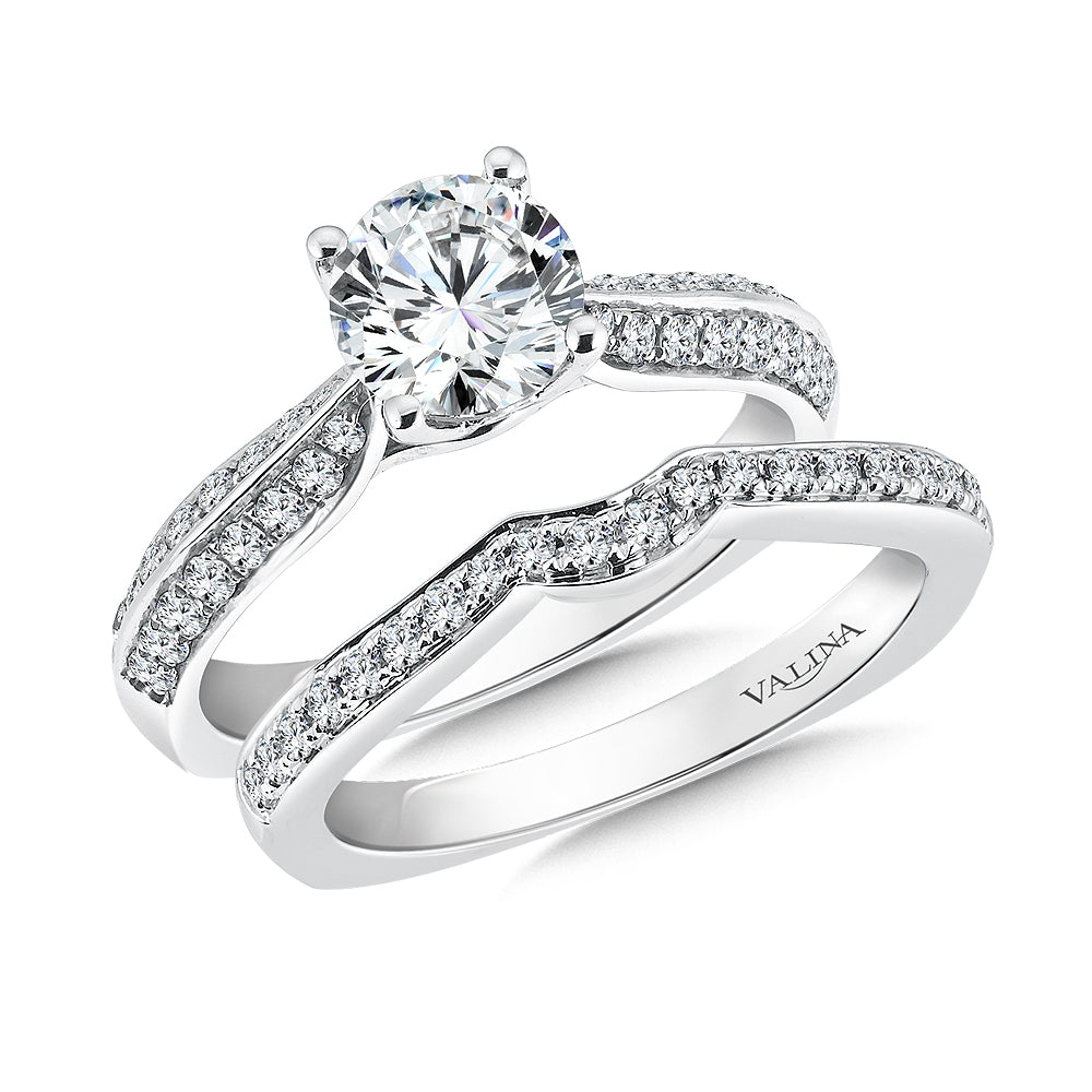 A beveled pinched diamond shank sweeps up, accentuating the round center stone creating a modern approach to this east-west classic 14K white gold engagement ring.