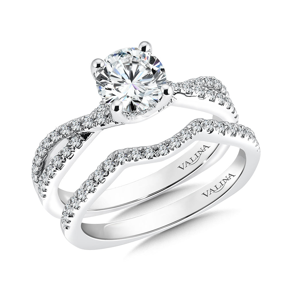 Bands of pave-set diamonds cross one another, creating four prongs that secure the center stone. Dainty diamonds in the center setting add sparkle to the design.