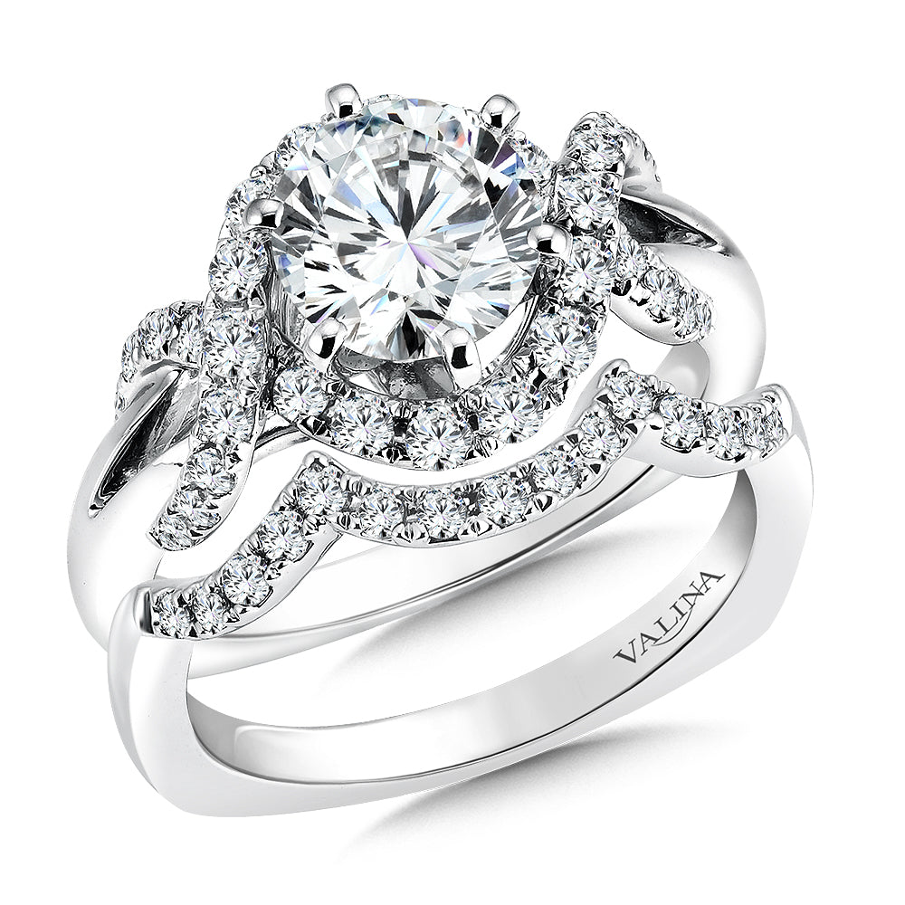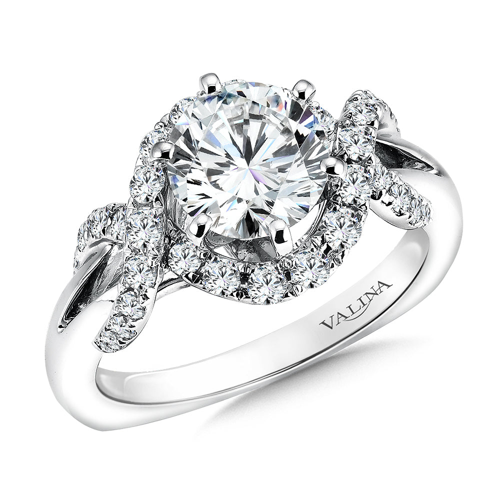 Two stands of diamonds boldly cross and surround the center stone. Bright polished split shoulders and an infinity gallery design are a delicate touch.