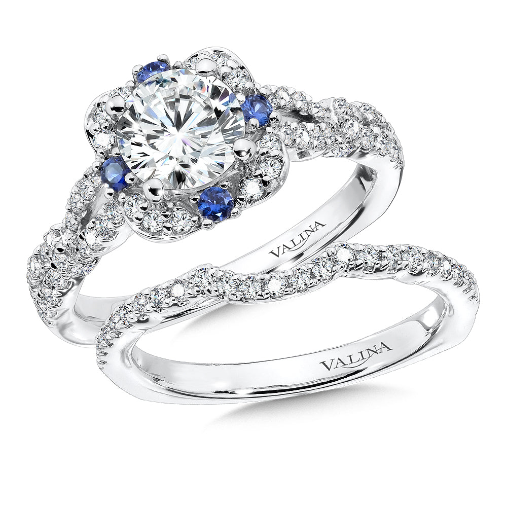 14K White Gold Floral Diamond And Blue Sapphire Criss-Cross Halo Engagement Ring