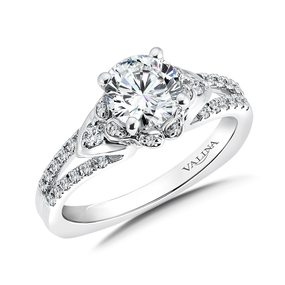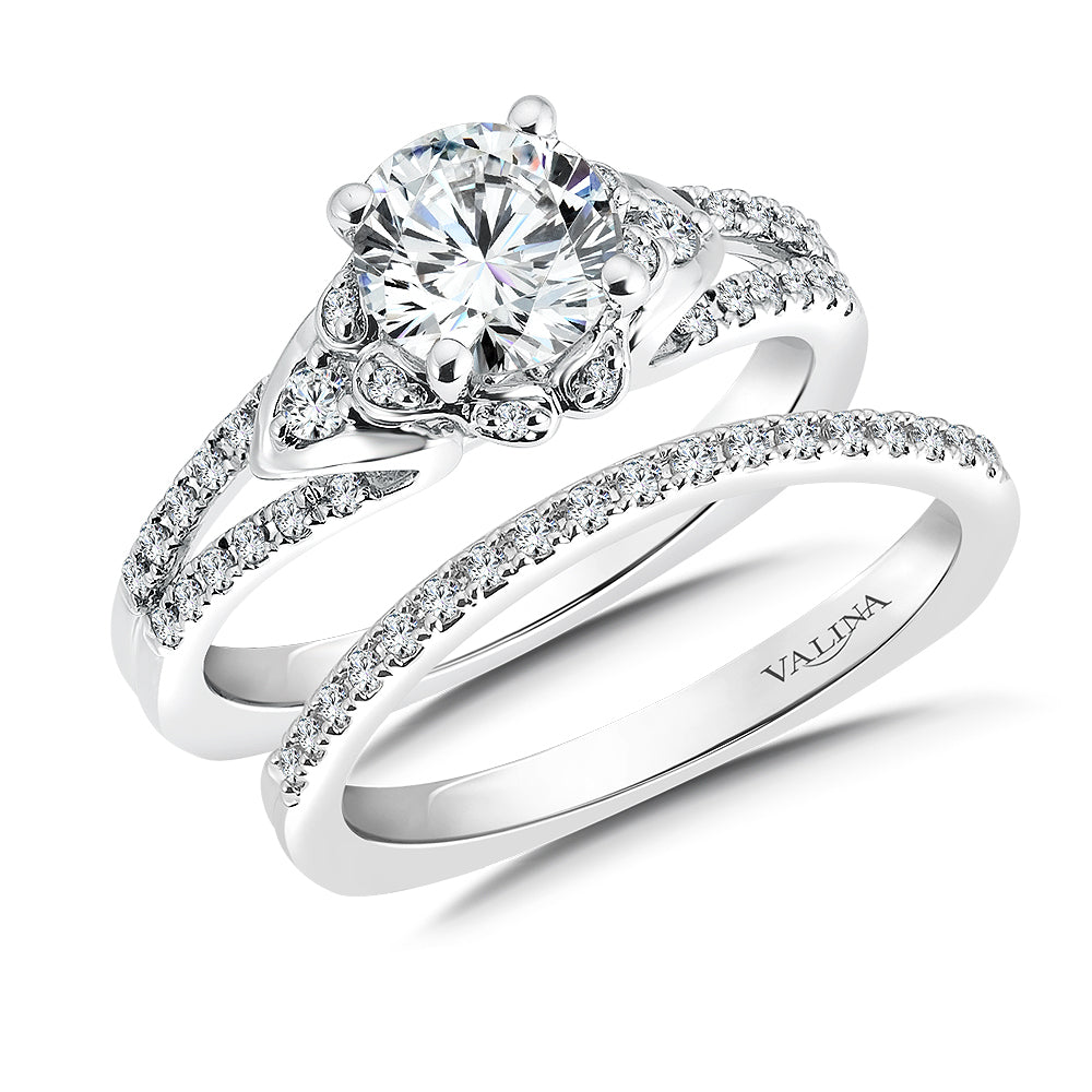 A center stone is framed by dainty bezel-set stones. Diamonds framed by polished gold petal motifs sit within delicate split sparkling bands representing your past, present, and future together.