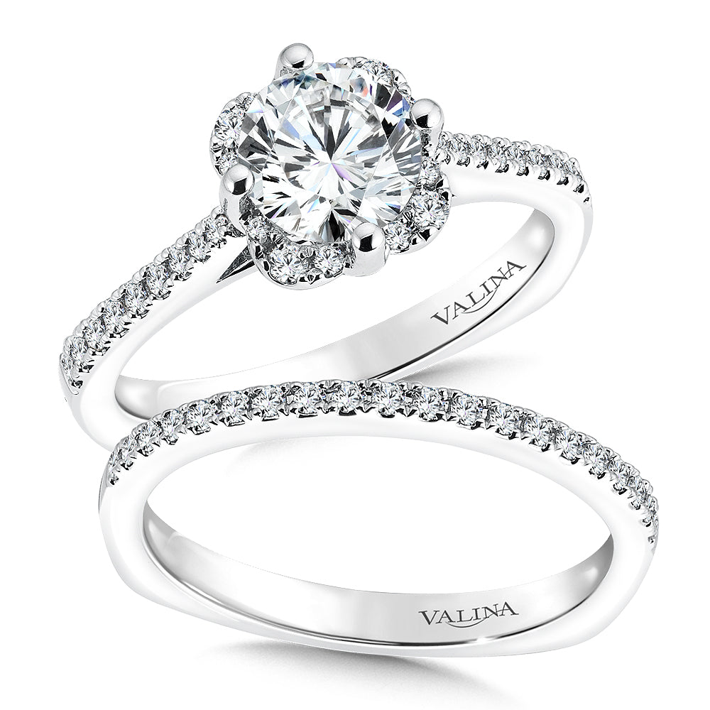 A delicate balance of the diamond floral halo and bold prongs sets the stage for the center stone. A single raised sparkling strand allows for a dainty basket design in the ring's profile.