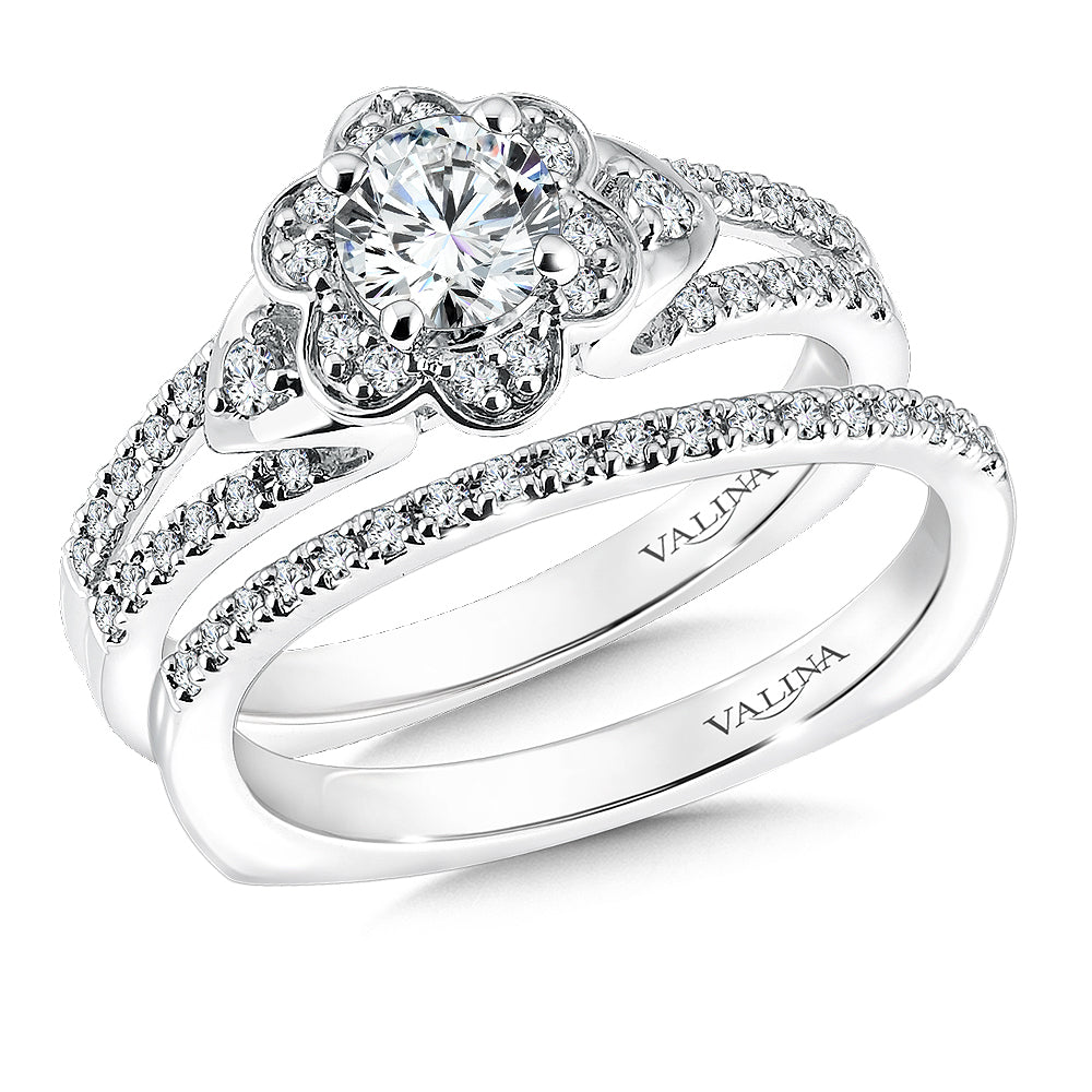 14K White Gold Floral Split Shank Halo Diamond Engagement Ring
