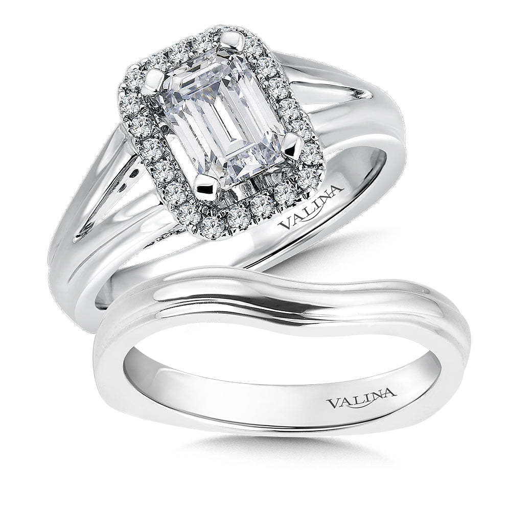 Polished ribbed bands gently split, supporting the Emerald cut framed by a diamond halo. A pave-set and surprise diamond profile are a beautiful finish.