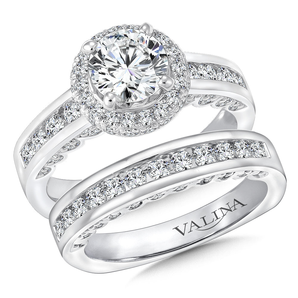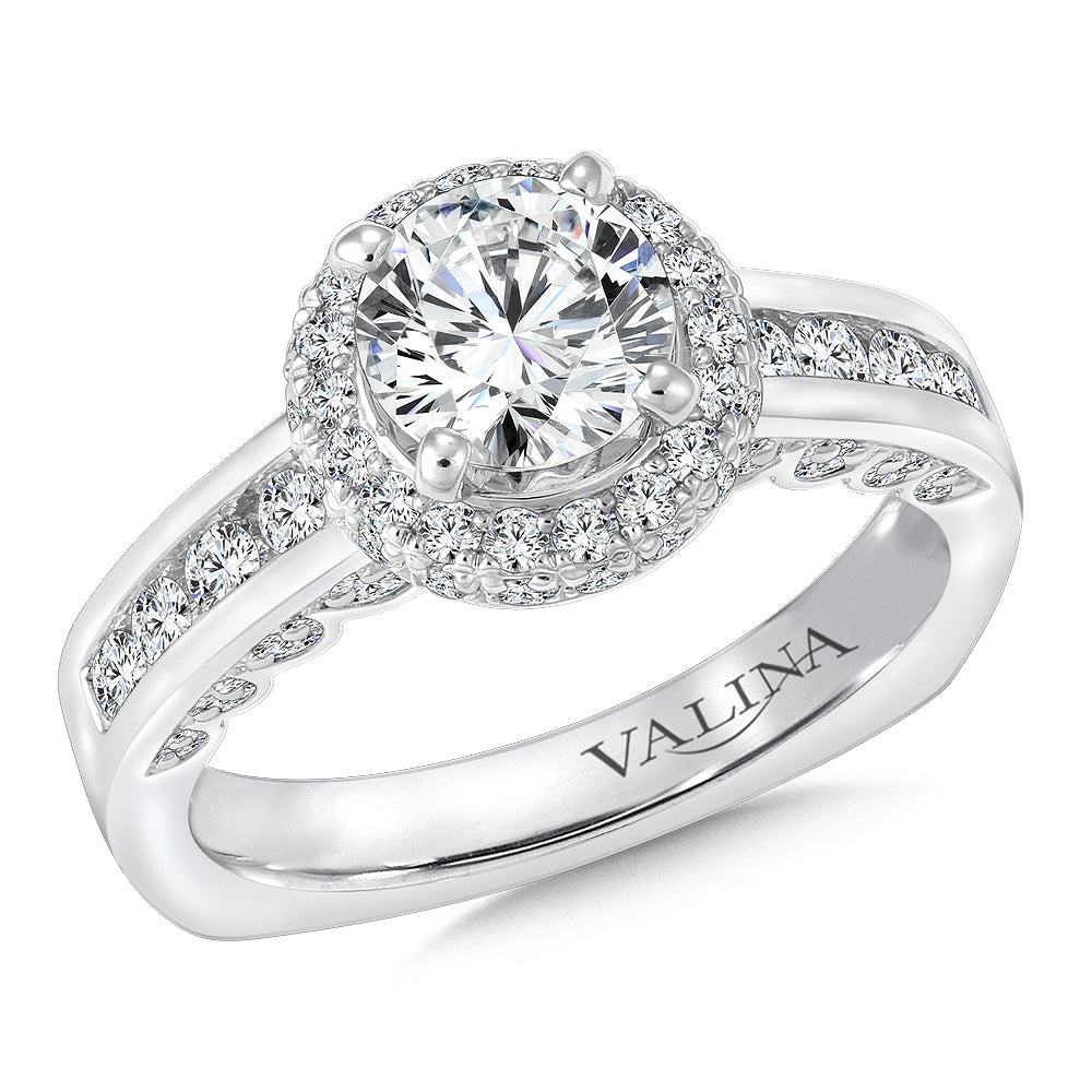 A round center stone emerged from a pillow of diamonds and was met by a band of large channel-set stones. The ring has a scalloped diamond finger rest.
