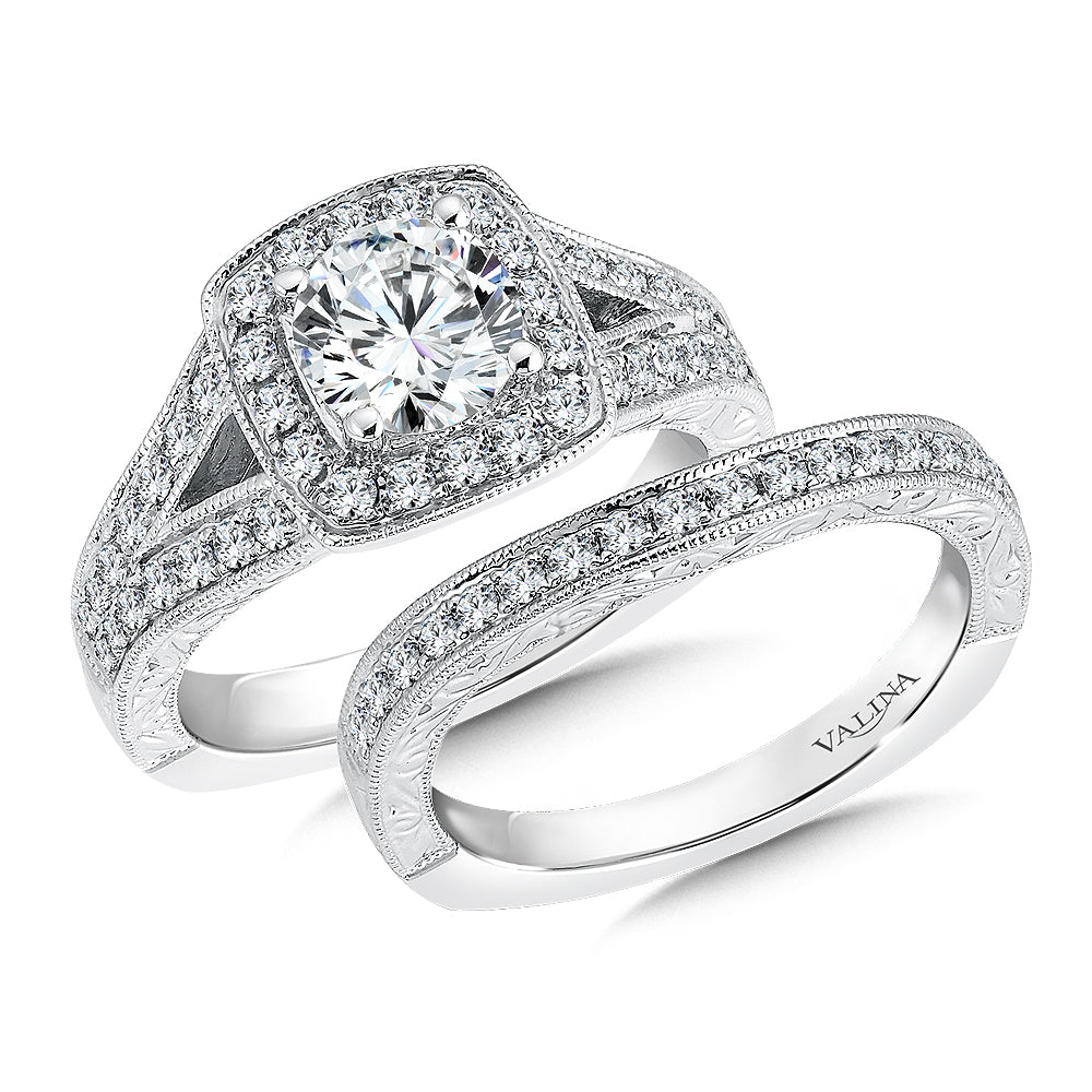 This all pave-set diamond ring with cushion shape halo and beveled split shoulders lights up the center stone. A surprise diamond, milgrain finish, and hand-engraved details add vintage flair.