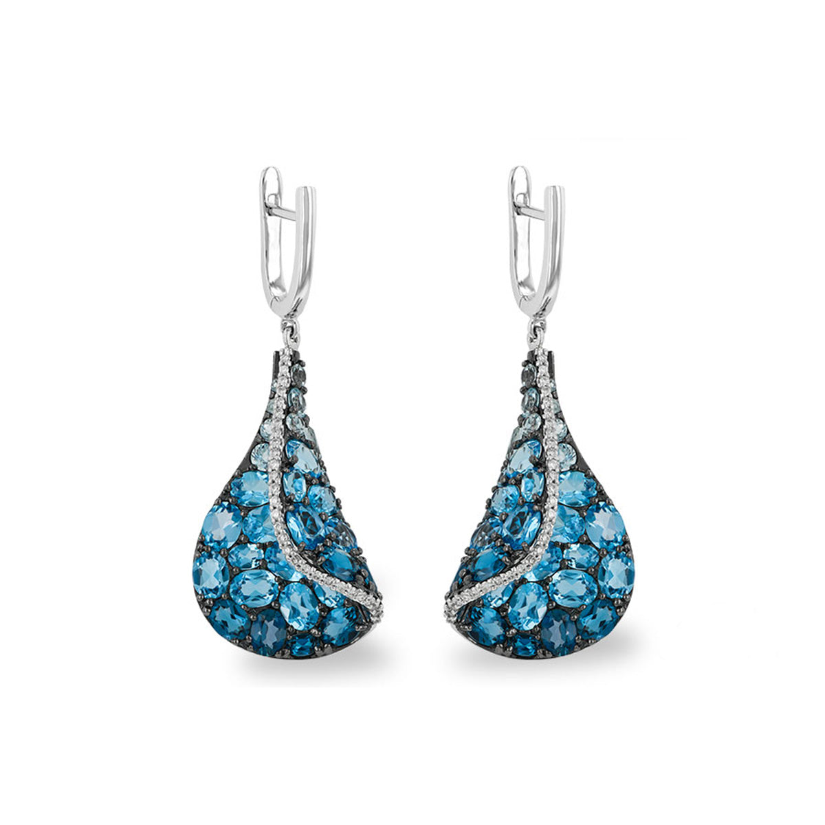 Elevate your style and sail away with our exquisite 14K White Gold Multicolor Topaz Diamond Earrings. These stunning earrings feature polychromatic topaz gemstones, meticulously pave set and graduated in color. The unique design is further enhanced with black rhodium prongs, adding a touch of drama and sophistication. A diamond mast elegantly divides the sides, creating a captivating visual effect. With a secure locking hinged back, these earrings are not only a beautiful accessory but also a comfortable and practical choice. Experience luxury and elegance like never before with our exceptional multicolor topaz diamond earrings.
