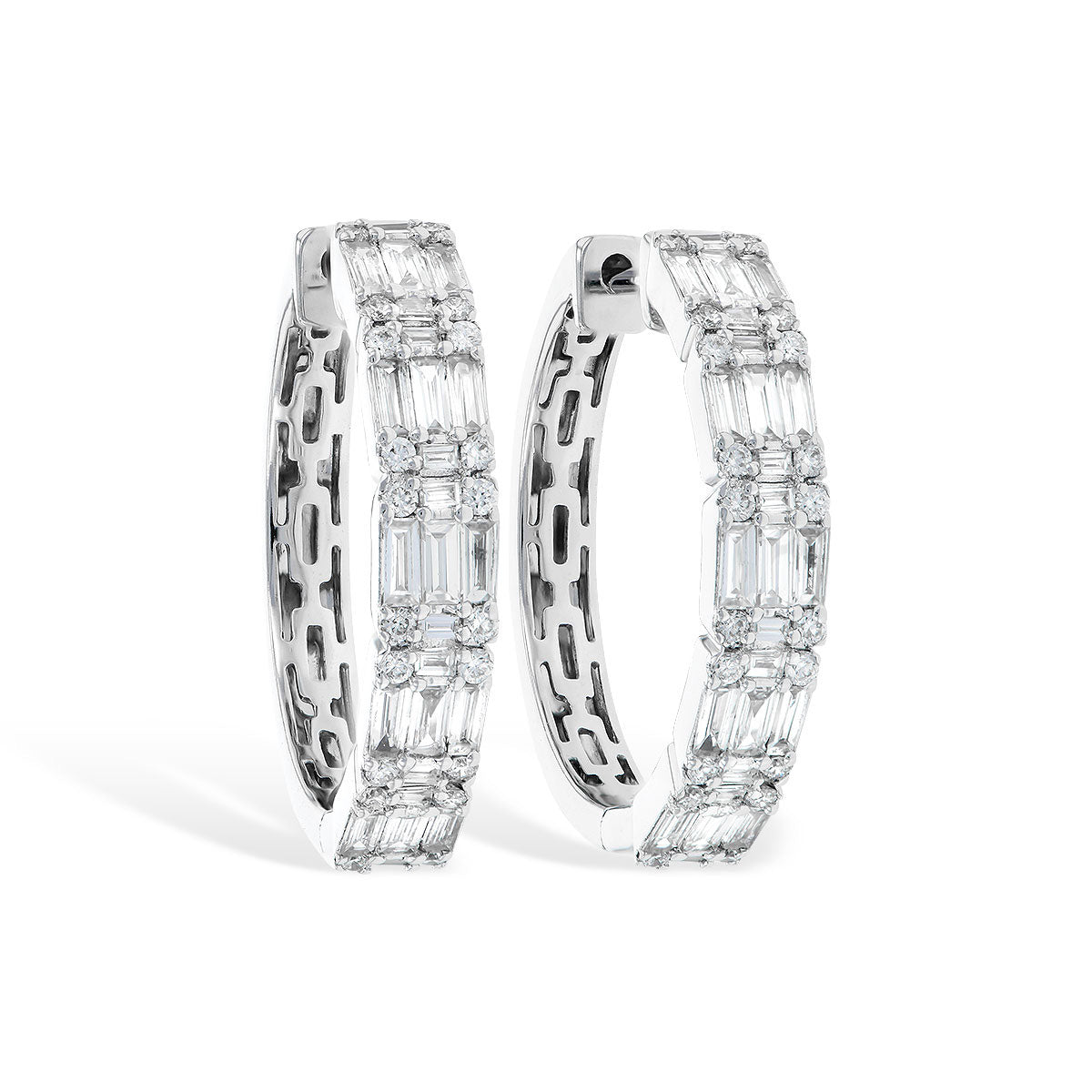 14K White Gold Round & Baguette Diamond Hoop Earrings