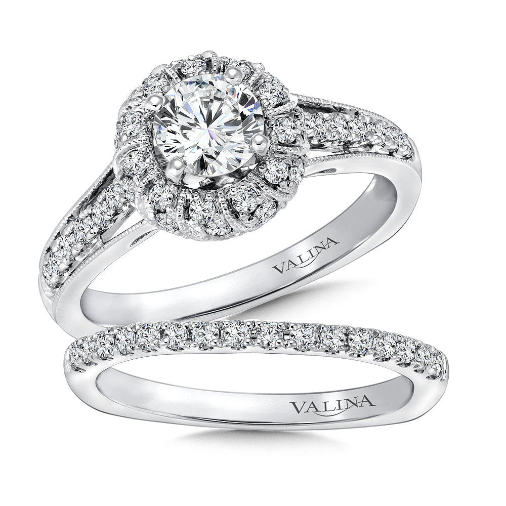 A halo of pave-set diamonds in a twisted rope design with a milgrain finish highlights the center stone. The diamond shoulders with open migraine strands add an heirloom feel.