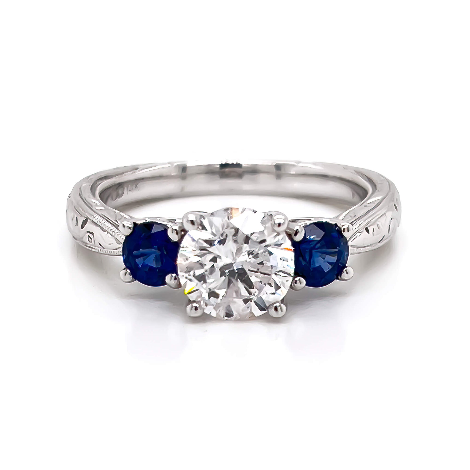 This stunning 14K White Gold Three-Stone Engagement Ring Semi-Mount with Sapphire Accents captures the essence of everlasting love. Carefully crafted with precision and attention to detail, this exquisite ring exudes sophistication and elegance. The centerpiece of the ring is your choice of a dazzling diamond or another gemstone that measures between 6.5mm to 7.5mm, radiating brilliance and beauty. Two brilliant cut cobalt-colored blue sapphires measuring 4mm each flank the center stone, adding a touch of vibrant allure. The 3mm wide band is also crafted from 14K white gold, ensuring durability and longevity. Its unique etched texture adds a touch of texture and visual interest, making this ring truly one-of-a-kind. This semi-mount engagement ring is perfect for those who appreciate timeless elegance and wish to symbolize their everlasting love. It's a captivating piece that is sure to leave everyone in awe and make a lasting impression.