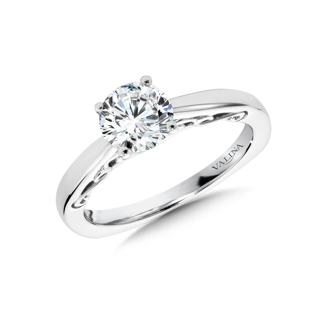 From above, a delicate tapered band hugs the glistening center stone, but from the side, a whirlpool of elegant filigree swirls appears. An accent diamond at the head's base finishes this classic ring's modern enhancements. Center Stone Sold Separately.