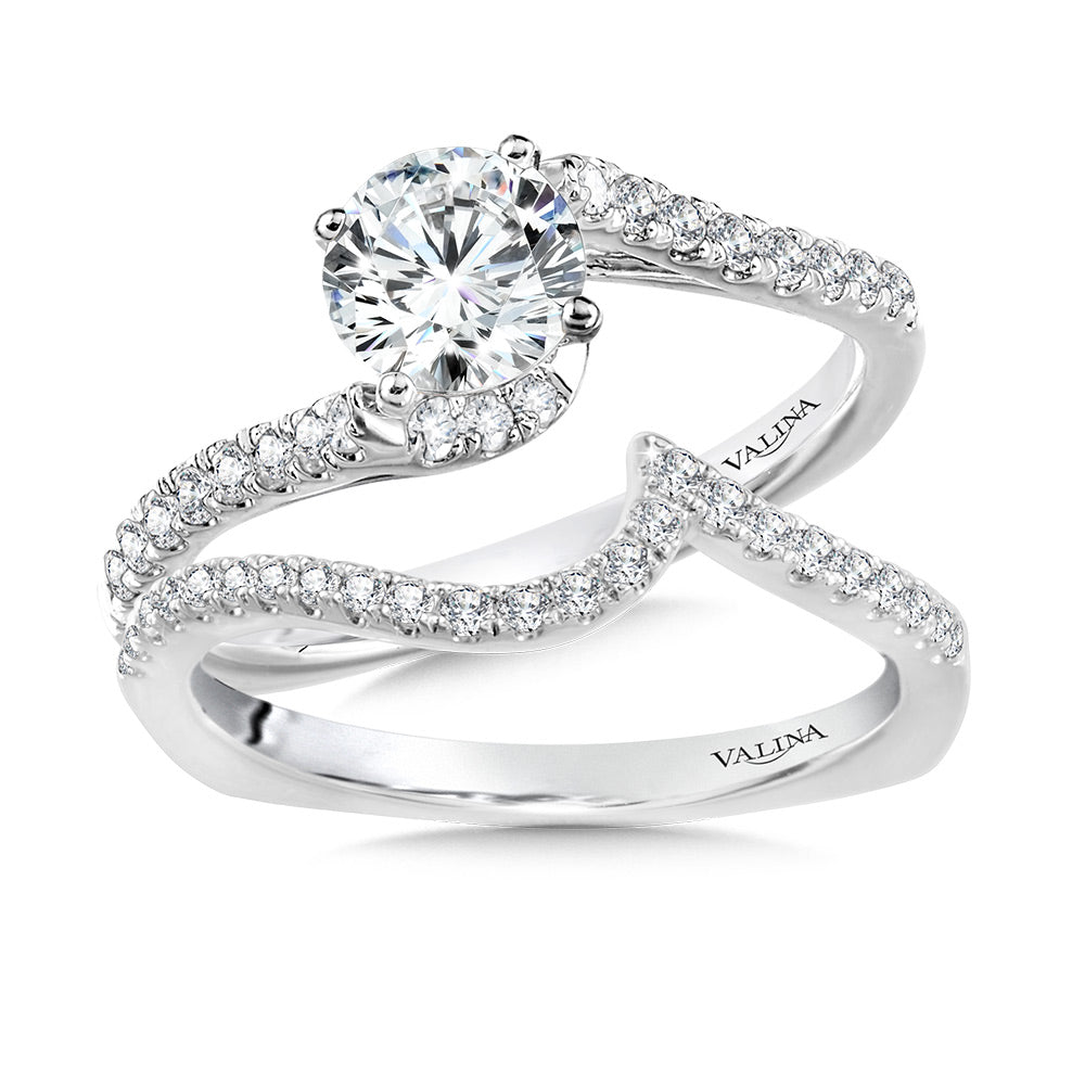A single row of diamonds makes up both sides of this bypass shank design. Unlike normal spiral rings, the shank doesn't smoothly encircle the center stone. Instead, right before reaching the stone top, it drastically angles downward, conne carating at the head's base. From the side, this creates a modern silhouette with two steep cathedral peaks.