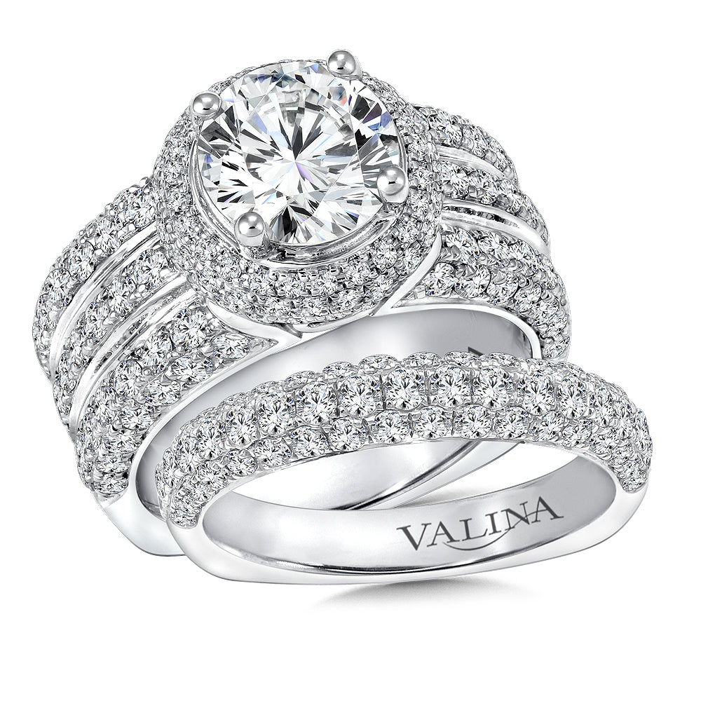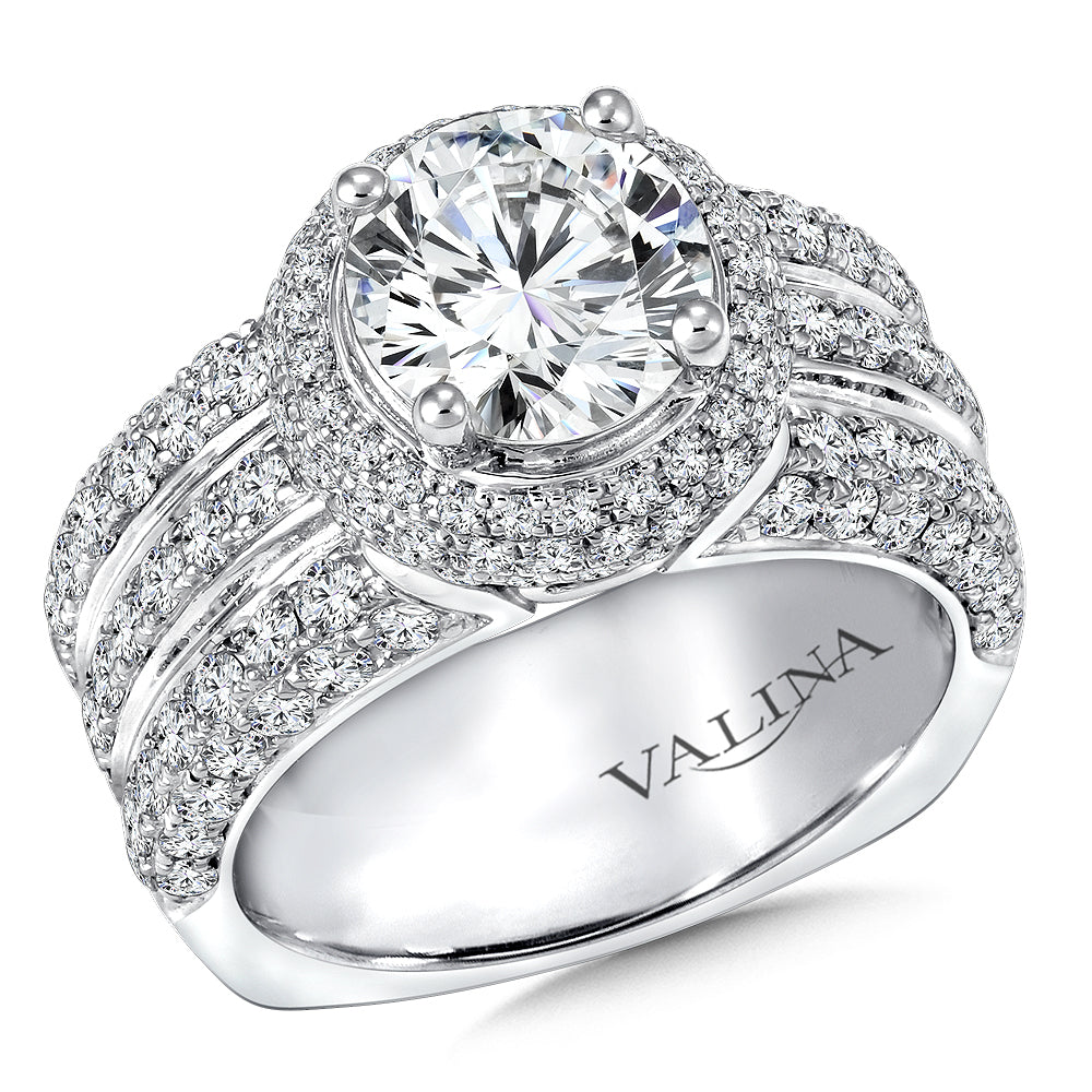 This modern statement engagement ring has it all; a double halo hugging a 2-carat center stone, and the widest Valina shank available. From above, the shank looks like five stackable bands layered together, including two two-row pave diamond bands on the ends, a single-row diamond band in the center, and two polished gold bands separating the three diamond bands. When these details combine, this statement engagement ring has a clean design and a spe caratacular sparkle that is sure to wow everyone in your life, especially when paired with its three-row pave diamond wedding band.