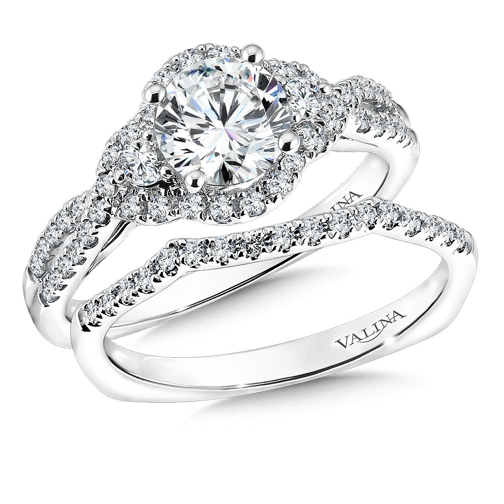 14K White Gold Three Stone Crossover Halo Diamond Engagement Ring