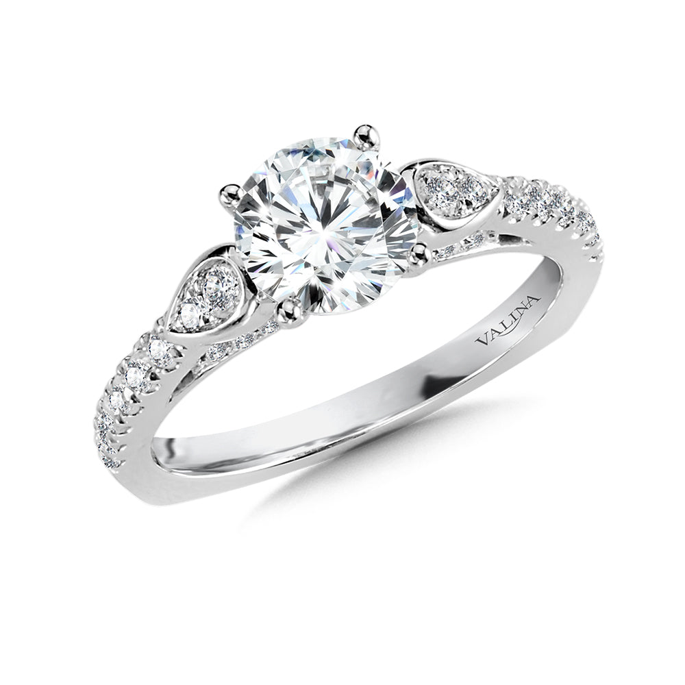 With the winged sides, this center stone soars above a cloud of sparkling accent diamonds. Gold swirls beneath the wings create a majestic but clean look to a classic design. Mounting in 14K white gold.