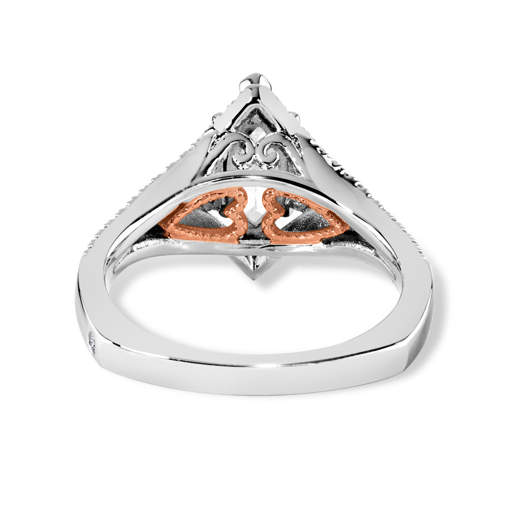 This 14K White Gold Marquise Pave Diamond Engagement Ring is the epitome of elegance and sophistication. The ring is crafted from high-quality 14K white gold which makes it durable and long-lasting. The marquise diamond is beautifully accented by a trio of diamonds on each side, and the chevron of pave diamonds leading into a union of paired diamonds on the band adds a touch of glamour. The European shank ensures a comfortable fit for everyday wear. The two Rose Gold Hearts planted on the underside of the ring symbolize the love and commitment between the two partners. This engagement ring is perfect for those who seek a timeless and classic design with a modern twist. It's the perfect way to make a statement and show your loved one how special they are.