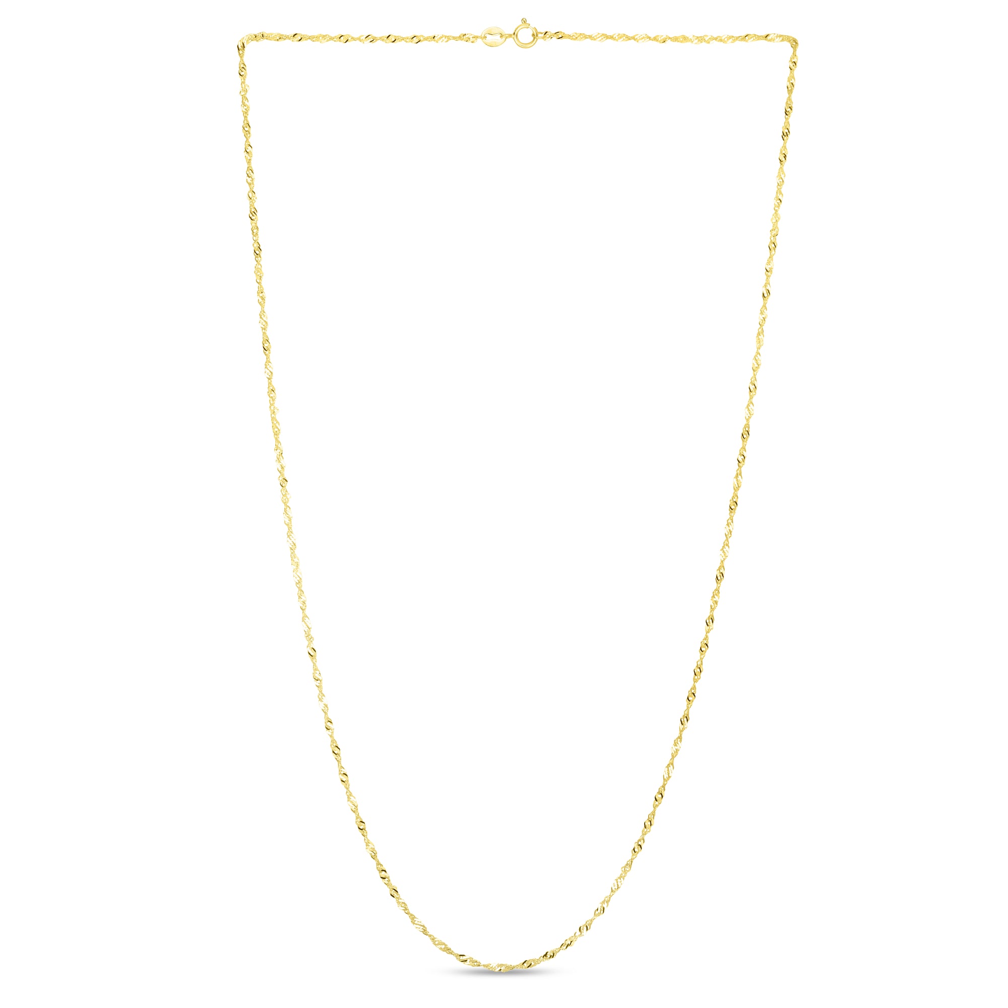 14K Gold 1.3mm Singapore Chain with Spring Ring Clasp also known as a 'twisted curb link' chain. The flat and curvaceous links of a Singapore are often described as having the look and feel of liquid, even when unraveled It's a vibrant and luxurious addition to any jewelry collection, delivering a uniquely stylish touch of elegance with an unmistakable sense of flow.