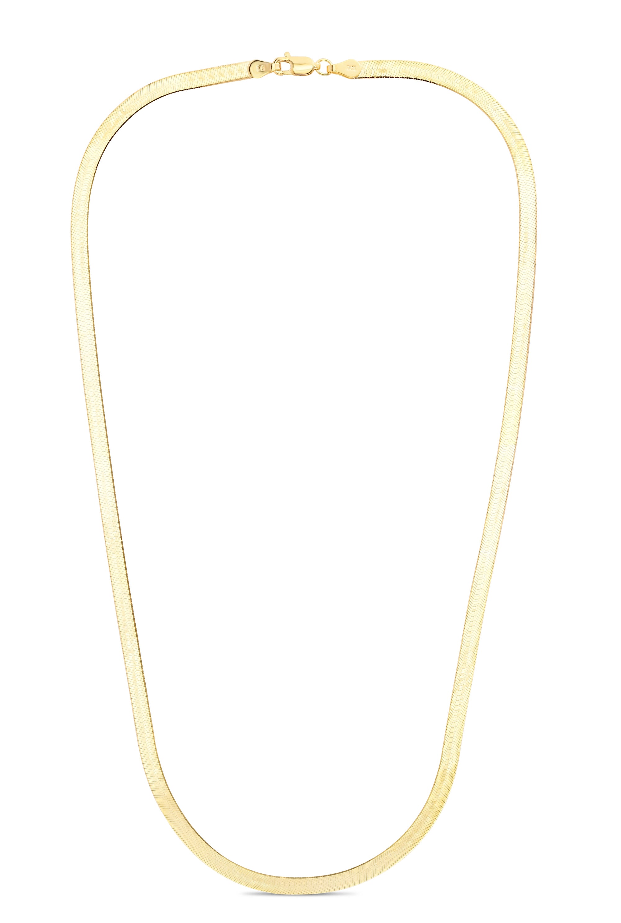 14K Gold 4mm Imperial Herringbone Chain is a super flexible and silky herringbone chain necklace with Lobster Lock. Experience the timeless beauty Herringbone Chain with Lobster Lock. An intricate tapestry of links, laid parallel, hearken back to its ancient Egyptian roots. With its delicate design, it lays flat on your skin, hugging curves and enhancing your look. Complete your look with the perfect finishing touch. This luxurious chain is a sophisticated statement piece sure to become a treasured favorite for years to come.