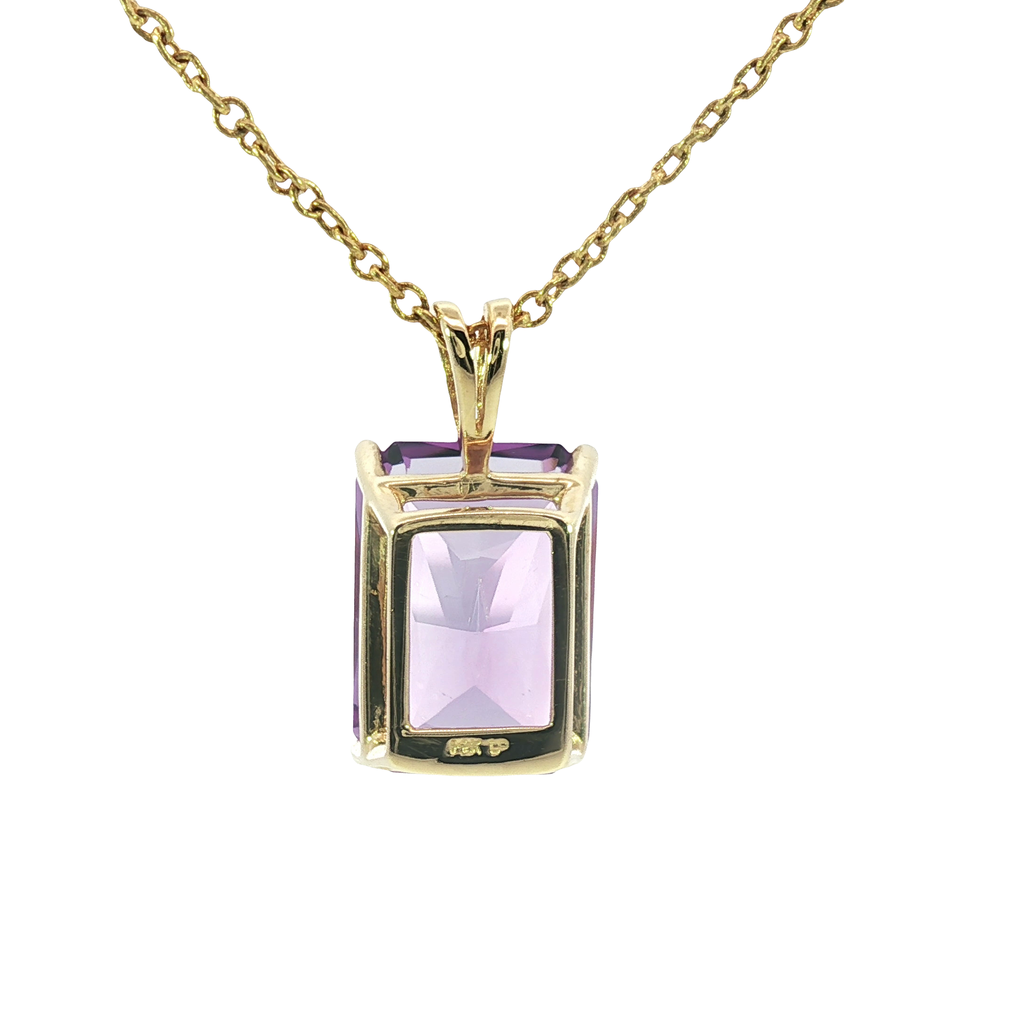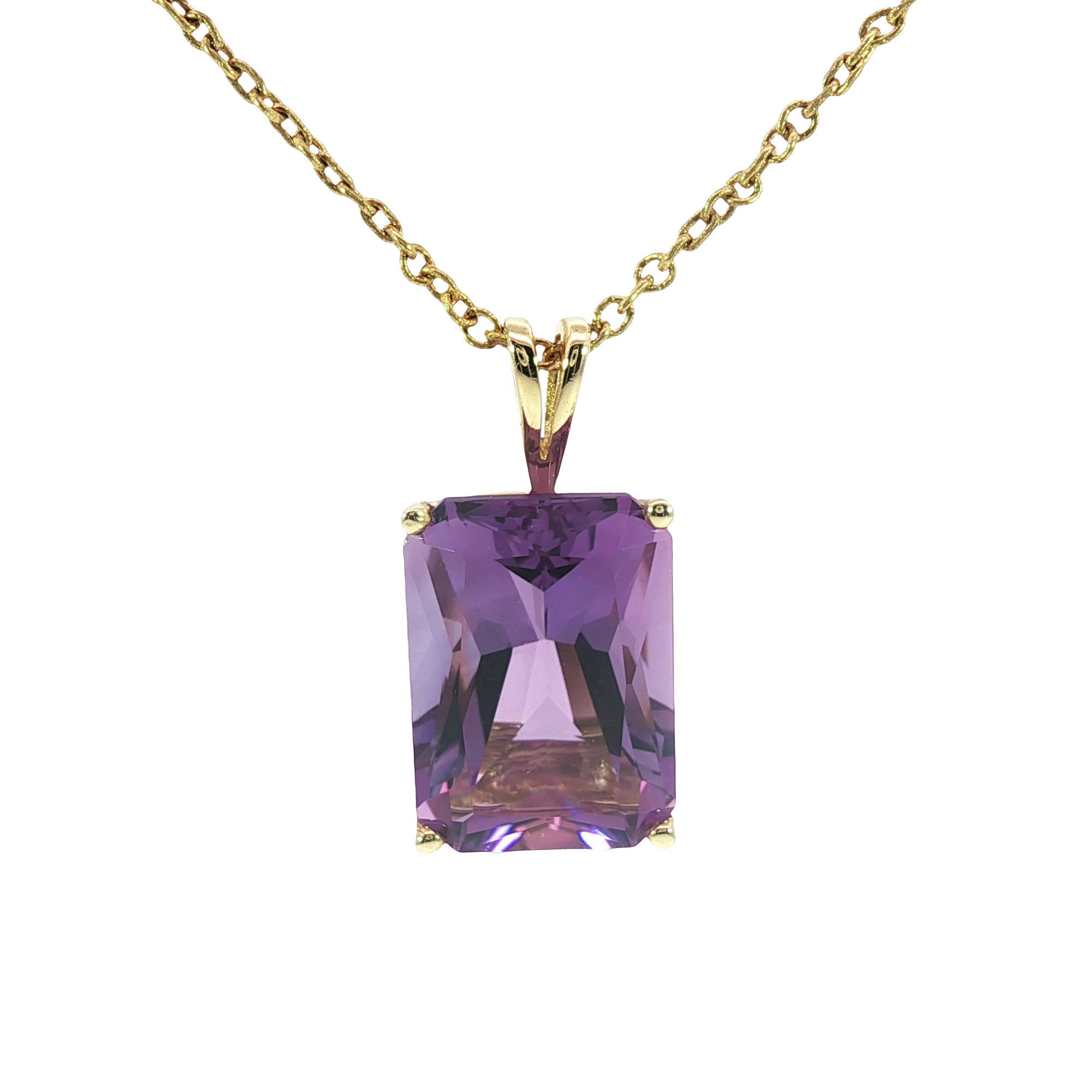 Charming estate necklace featuring a vibrant, purple amethyst gemstone, skillfully cut in an emerald shape with a step cut style. The amethyst is set in a 14K yellow gold base metal, enhancing the stone's rich hue and clarity. The pendant gracefully hangs from a delicate yellow gold chain, creating an elegant and eye-catching design.