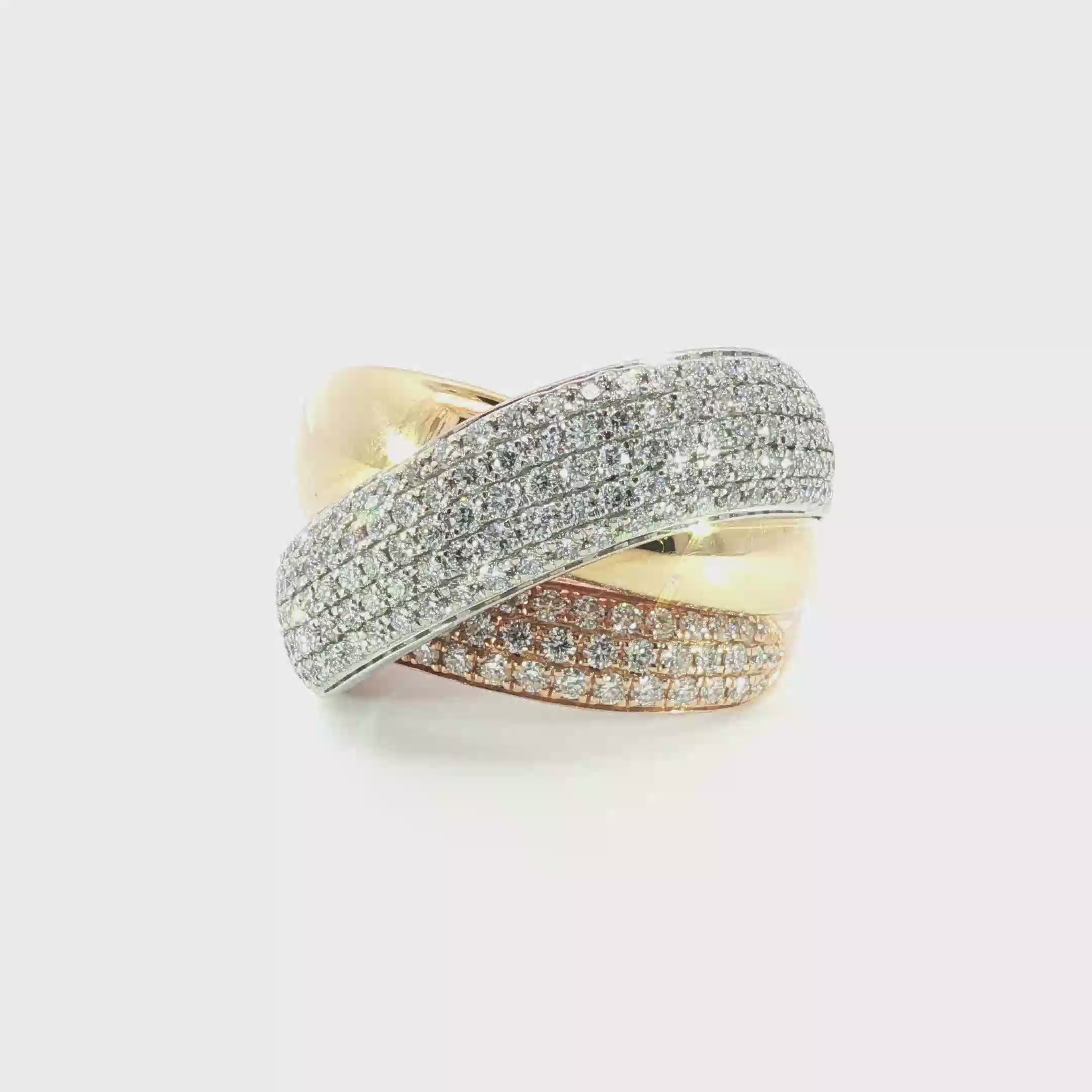 Indulge in the mesmerizing allure of this diamond statement ring, crafted in radiant 18K tri-tone white, yellow, and rose gold. Showcasing brilliant-cut round diamonds set in an intricate arrangement. This bold, modern piece embodies luxury and sophisticated style, making it perfect for creating an unforgettable sight to behold.