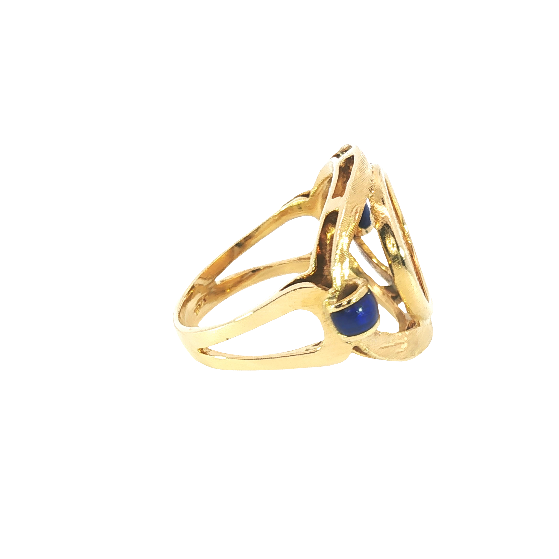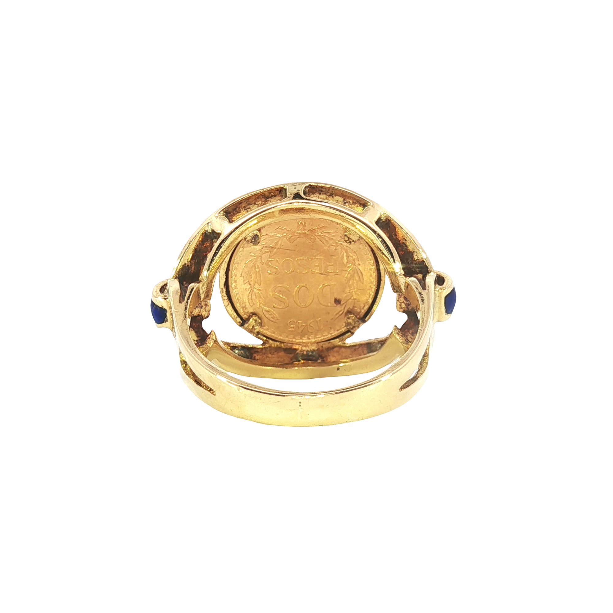 Elevate your collection with this distinctive 18K yellow gold ring. The design incorporates a captivating coin element, meticulously framed with ornate detailing. Striking accents of dark blue add a sophisticated touch, enhancing the ring's unique character and vintage appeal.